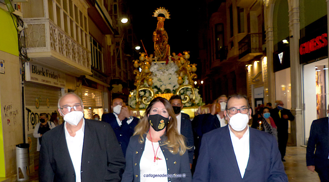 La patrona más antigua de Cartagena, tras la celebración de una eucaristía, volvió a salir en procesión (esta vez en rogativa por el pleno cese de la pandemida) dentro de un cortejo con similar protagonismo para hombres y mujeres, incluidos el grupo mixto de portapasos y los tres capataces, que fueron José Antonio Gómez, Matilde Padín y Fernando Morata, a quienes se observa en la fotografía superior.
