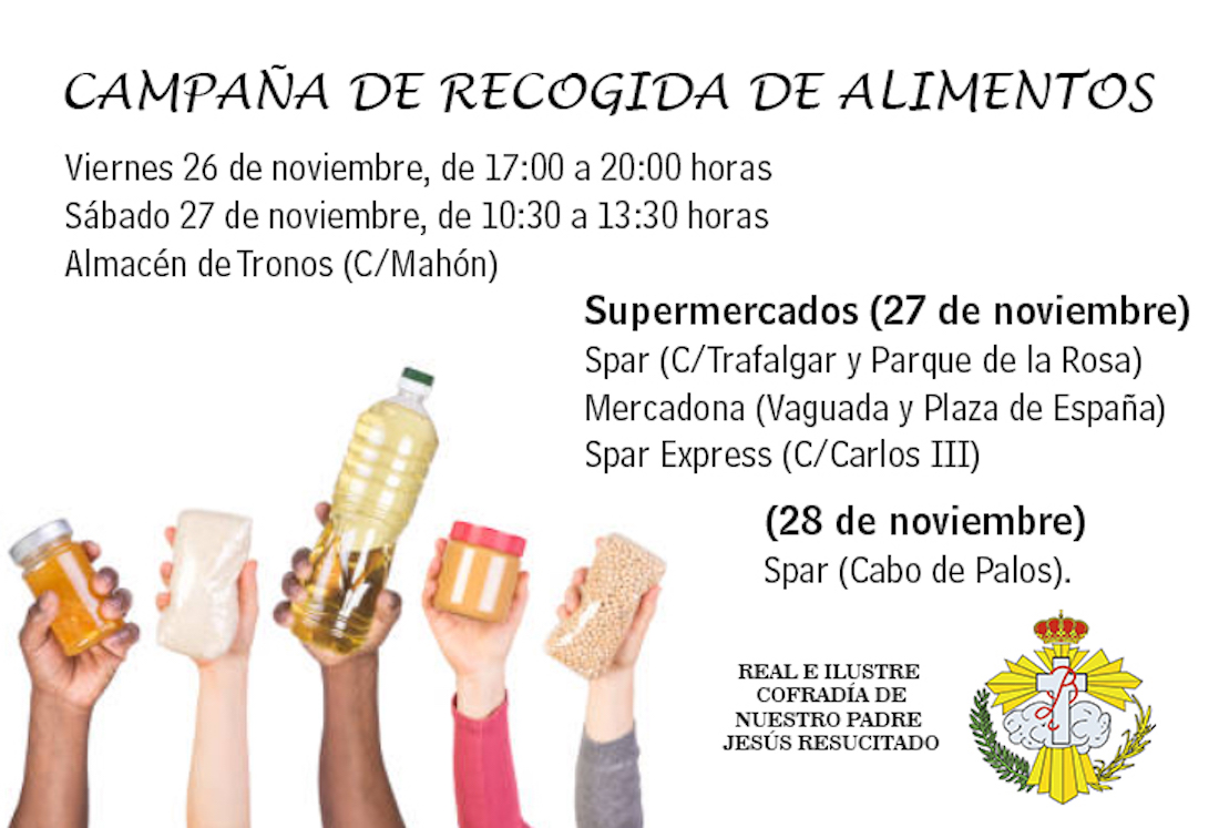 La Campaña de Recogida de Alimentos tendrá varias sedes. Una de ellas será el almacén de tronos e imágenes de la Cofradía del Resucitado, en la calle Mahón, donde se recogerán alimentos no perecederos y productos de higiene el viernes 26 de noviembre de 17:00 a 20:00 horas y el sábado día 27 de 10:30 a 13:30 horas. También se podrá hacer entrega de donativos en metálico.