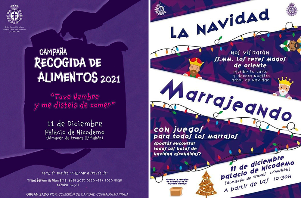 La Cofradía de Jesús Nazareno celebra este sábado su campaña solidaria en el Palacio de Nicodemo (almacén de tronos de la calle Mahón) en una jornada que, en el mismo lugar, a partir de las 10.30 horas, se desarrollará la actividad 'La Navidad marrajeando', con juegos y la presencia de Sus Majestades de Oriente para recoger las cartas. También será decorado el árbol navideño.