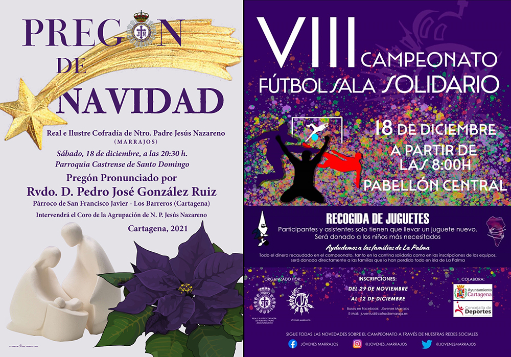Las actividades organizadas por la Cofradía de Jesús Nazareno incluye este sábado la disputad del octavo campeonato de fútbol sala, que acogerá una recogida de juguetes y una recaudación para ayudar a las familias afectadas por el volcán isleño d La Palma. Por la noche, Pedro José González Ruiz ofrecerá el pregón de Nav¡dad de la hermandad y el martes próximos se inaugurará una exposición solidaria de pintura, mientras que el 5 de enero tendrá lugar el Belén viviente.