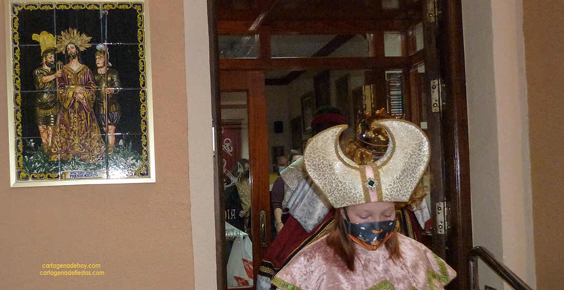 El acto organizado por las diferentes áreas de la Cofradía de Jesús en el Paso del Prendimiento es el primero de este año en Cartagena con los Magos de Oriente, que ya toman el relevo de Papá Noel y serán los grandes protagonistas en los próximos días por diferentes puntos del municipio. La tarde procesionista en la calle del Aire se completó con una recogida de juguetes para entregar a familias necesitadas.