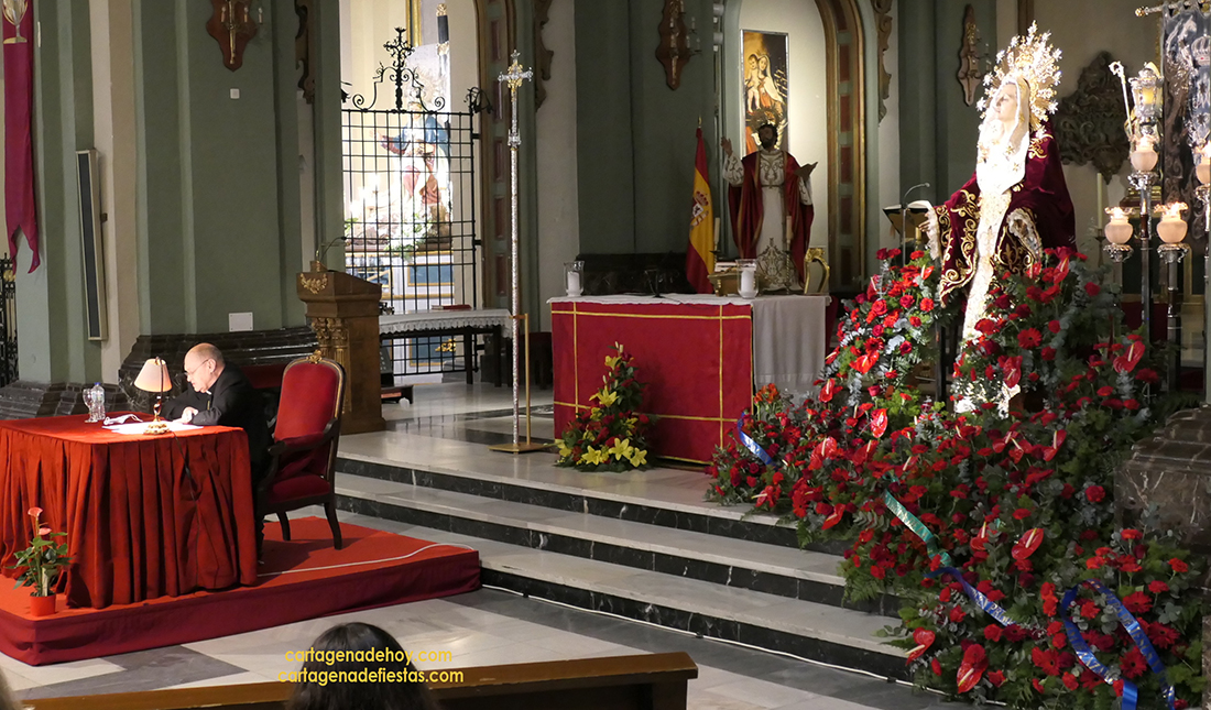 El sacerdote Ángel Obradors Rosique ofreció en la iglesia de Santa María, ante una imagen del Primer Dolor envuelto en un mar de tulipanes rojos, el pregón de apertura de los actos del 75 aniversario de la llegada de la imagen que creó el imaginero Mariano Benlliure, cuyo programa ofrece esta noche un concierto de la ‘Capilla de música de Cartagena’, mientras que el domingo tendrá lugar la eucaristía de veneración del vigésimo segundo aniversario de su coronación canónica.