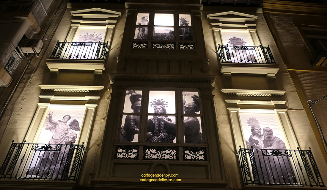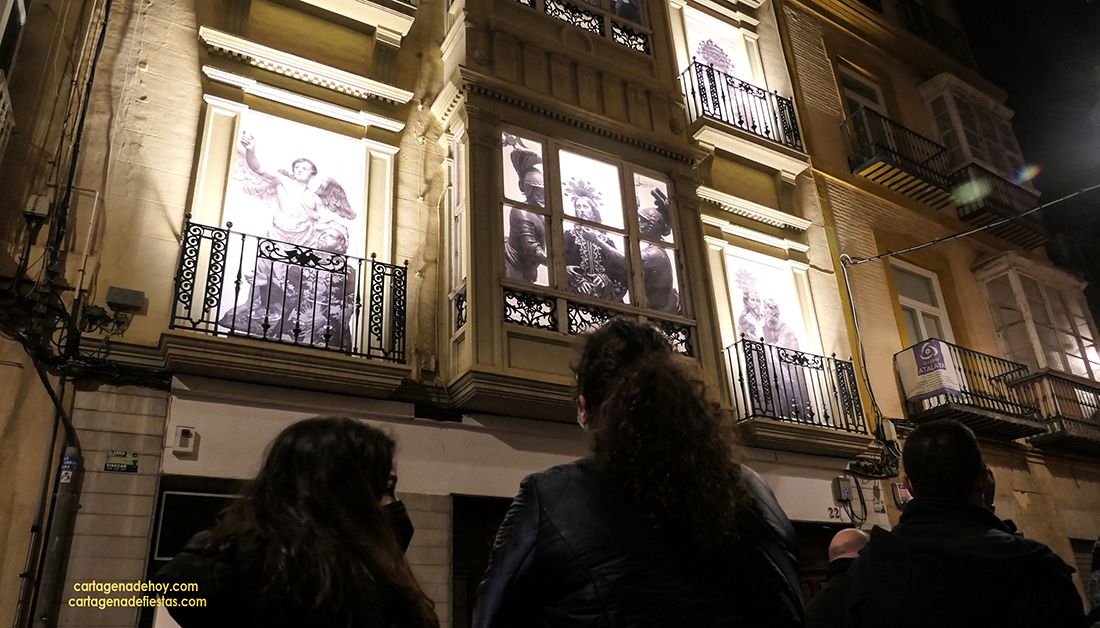 En la misma calle de Aire, muy cerca de donde fueron quemadas (frente a la iglesia de Santa María en 1936, en el inicio de la Guerra Civil), las imágenes de siete obras que creó el gran imaginero Francisco Salzillo y una de su discípulo Roque López (San Pedro) vuelven a ser contempladas desde las calles del casco urbano de la ciudad, lugar por el que desfilaron en procesión en los primeros años de la hermanad de Cristo en el Paso del Prendimiento, consitituida en 1747 y que ahora inicia los actos de su 275 aniversario con esta exposición denominada ‘Como era en un principio’, en la que los viadantes pueden contemplar cómo eran aquellas tallas de la Virgen del Primer Dolor, la Samaritana y San Juan, según las que se observan en lo más alto de la fachada; Jesús y el ángel de la ‘Oración del huerto’, Cristo del Prendimiento y el Ósculo, en el primer piso; y San Pedro y Santiago, a pie de calle.