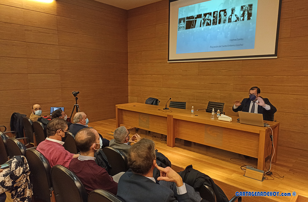 Agustín Alcaraz Peragón abrió el ciclo de conferencias sobre la Semana Santa que organiza Cartagena Siempre explicando las procesiones de la Cofradía Marraja, que en el siglo XVII tomó el relevo de los dos cortejos pasionarios que organizaba la Cofradía del Rosario y que en la actualidad muestran casi todas las estaciones del vía crucis.