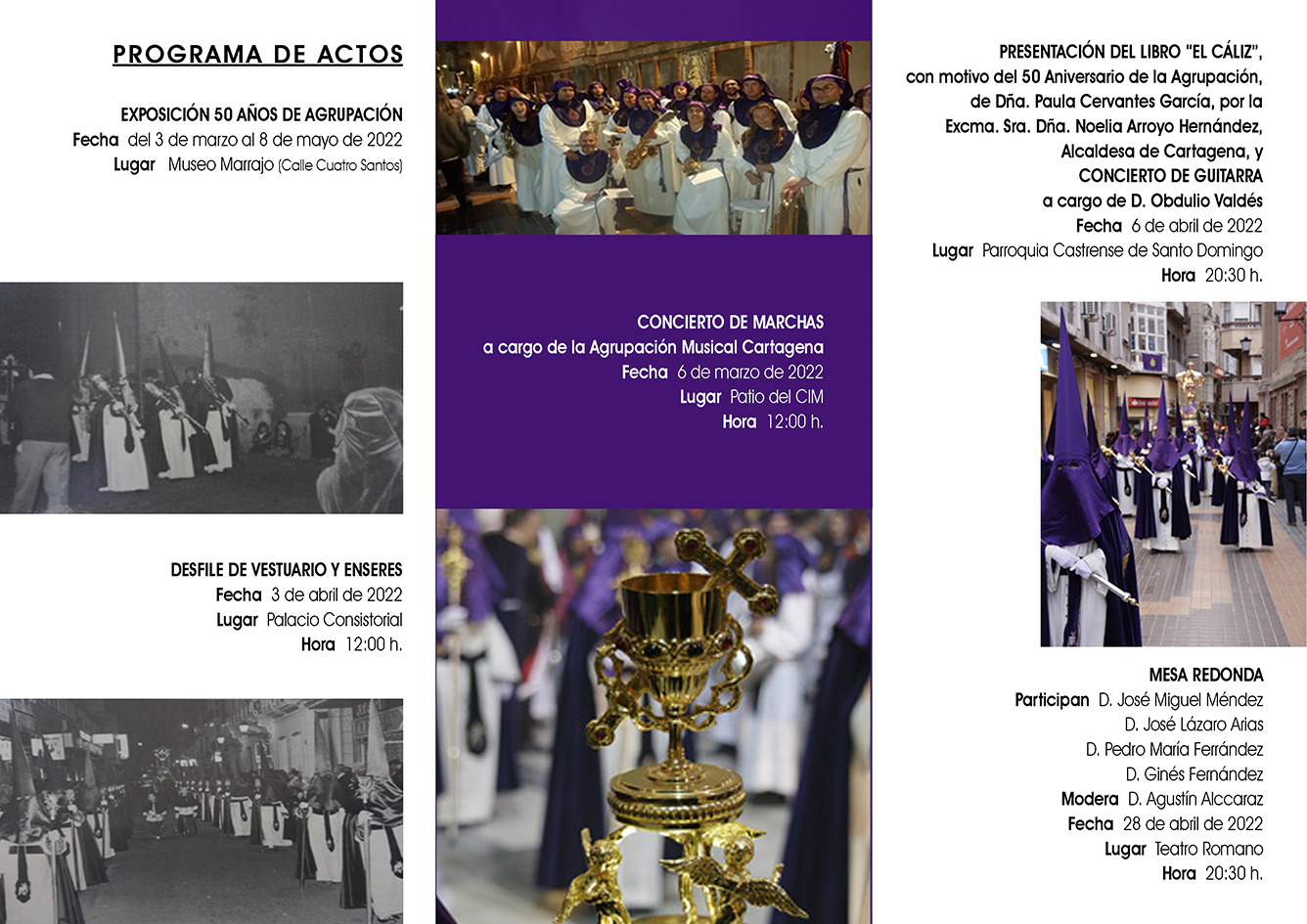 La programación de actividades comenzará este jueves, 3 de marzo, con la inauguración de la exposición sobre su 50 aniversario en el que se exhibirán mazas, achotes y otros objetos característicos del Santo Cáliz. La muestra se podrá visitar en el Museo de la Cofradía Marraja, ubicado en la calle Cuatro Santos, hasta el próximo 8 de mayo.