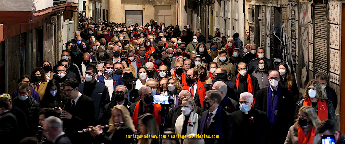 A las ocho y tres minutos se inicia la recogida desde la calle Palas con los sones de ‘Micaela’ que ofrece la agrupación musical Cartagena 1990 en cabeza de la comitiva, figurando al frente el ‘incombustible’ marrajo Tomás del Pozo. La primera escala estaba ante la sede marraja, donde la banda de música se ha detenido y girado para tocar una pieza dedicada a los comisarios de esta cofradía. La idea era hacer lo mismo en las siguientes, pero no ha podido ser para no alterar el horario de llegada al Palacio Consistorial. Se han sucedido los encuentros-recogida entre los cofrades de los distintos colores pasionarios, con imposición de alfileres. Después, juntos se han dirigido hacia la sede municipal, variando en esta ocasión el recorrido al completarse la calle del Aire y evitarse la calle Mayor para una mayor seguridad sanitaria ante la aglomeración de personas.