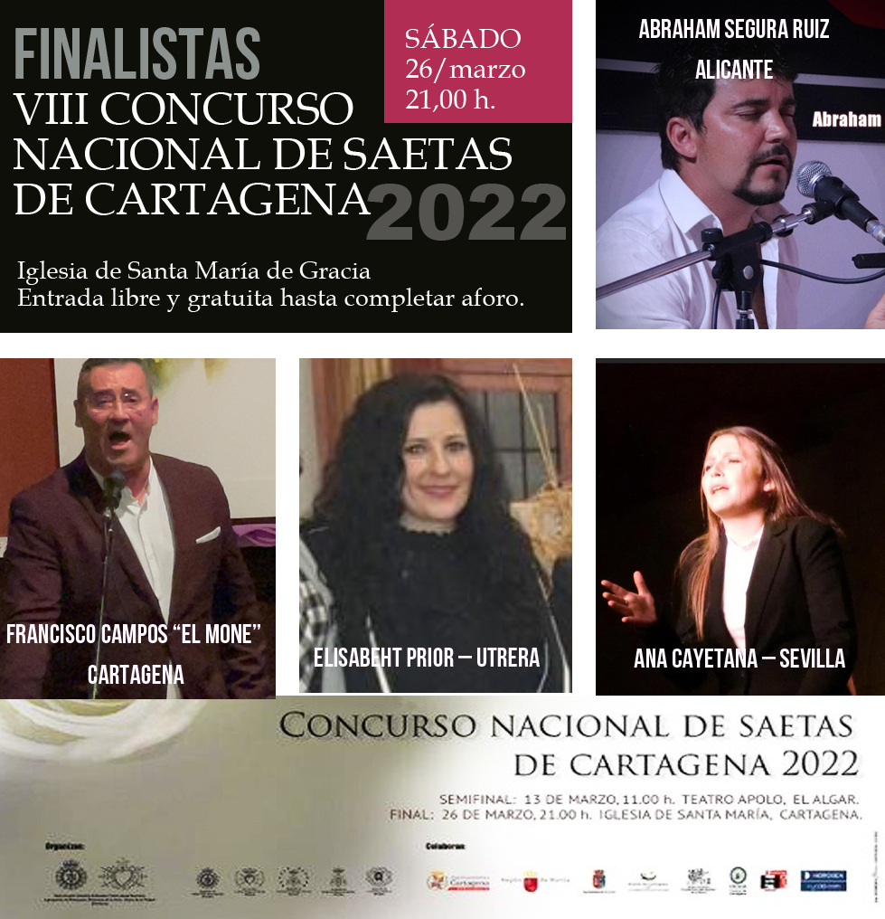 El jurado del Concurso Nacional de Saetas de Cartagena, tras una intensa deliberación, ha decidido que los cantaores y cantaoras: Francisco Campos “el Mone”, de Cartagena; Ana Cayetana, de Sevilla; Elizabeth Prior, de Utrera y Abraham Segura Ruiz, de Alicante, pasen a la final de este prestigioso certamen.