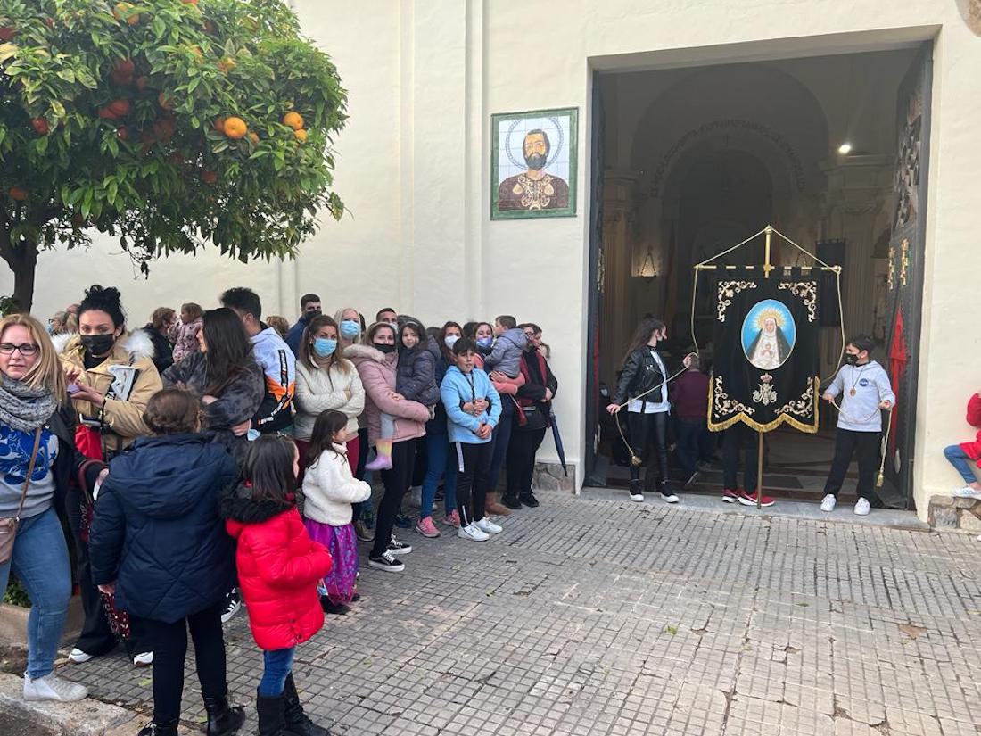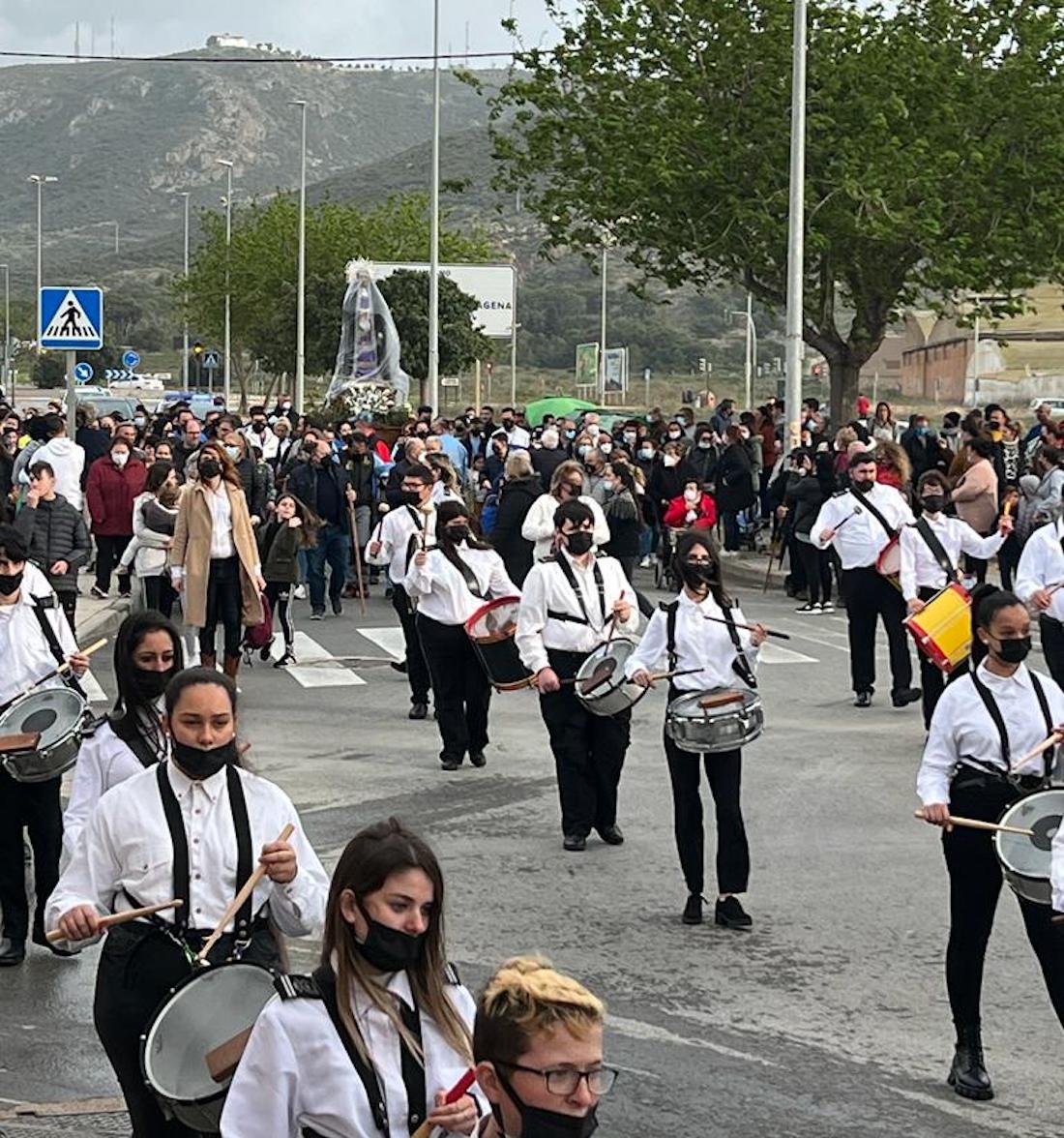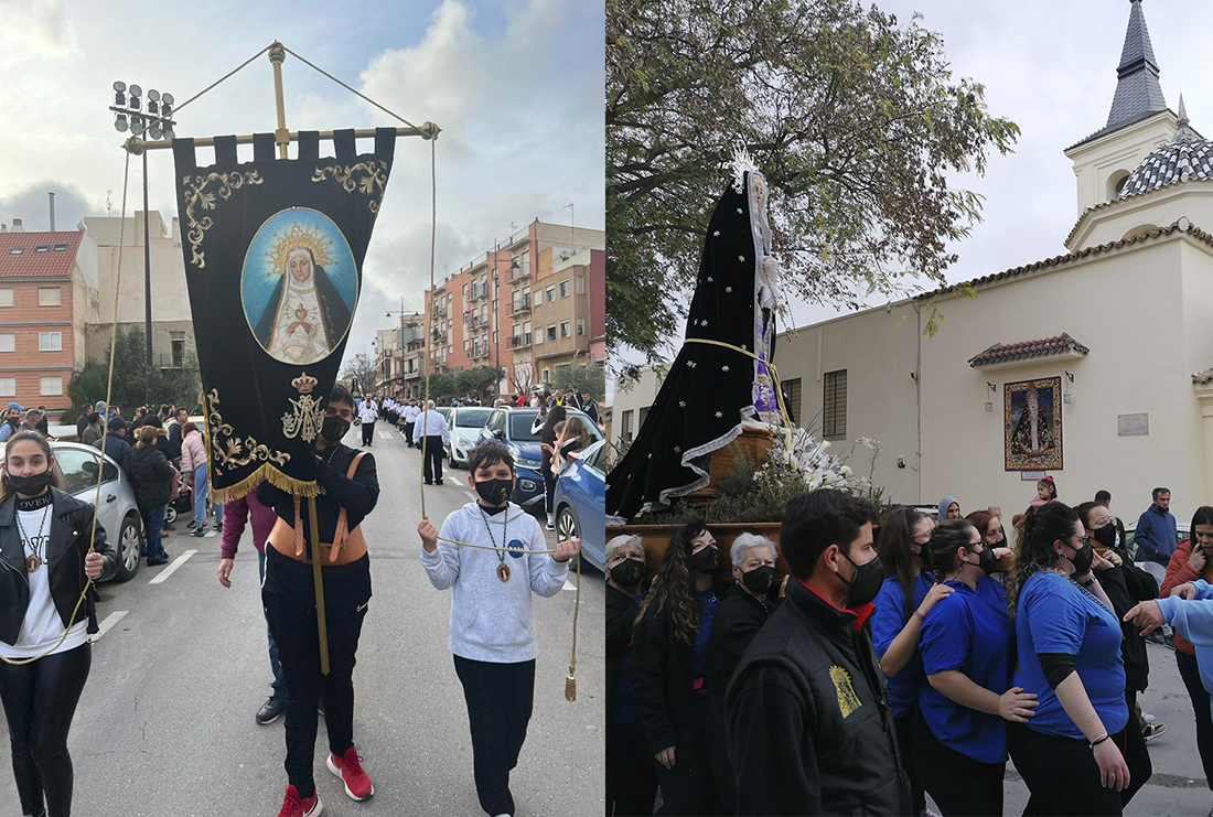 Numerosos fieles han acompañado esta tarde a la Soledad desde su ermita hasta la parroquia de Santa Lucía, en una romería que no tenía lugar desde 2019 y cuyo paso abrían el estandarte y la banda de música.