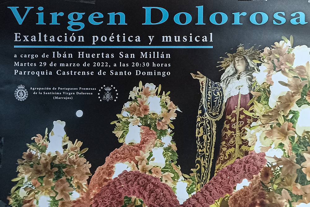 El acto poético y musical en honor a la Virgen Dolorosa tendrá lugar el próximo martes, 29 de marzo, a las 20.30 horas, en la parroquia castrense de Santo Domingo, en la calle Mayor de la ciudad, organizada por la agrupación de Portapasos Promeras de la virgen de la Piedad.