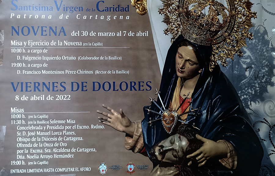 La novena en honor a la Virgen de la Caridad tendrá lugar del 30 de marzo al 7 de abril en la capilla, con eucaristías a las 10 y a las 19 horas. El Viernes de Dolores (8 de abril) las misas serán a las 10 y a las 19 horas en la capilla y a las 11.30 horas en la basílica, la cual será concelebrada, estando presidida por monseñor José Manuel Lorca Planes. En la misma se llevará a cabo la ofrenda floral a cargo de la alcaldesa de Cartagena, Noelia Arroyo.