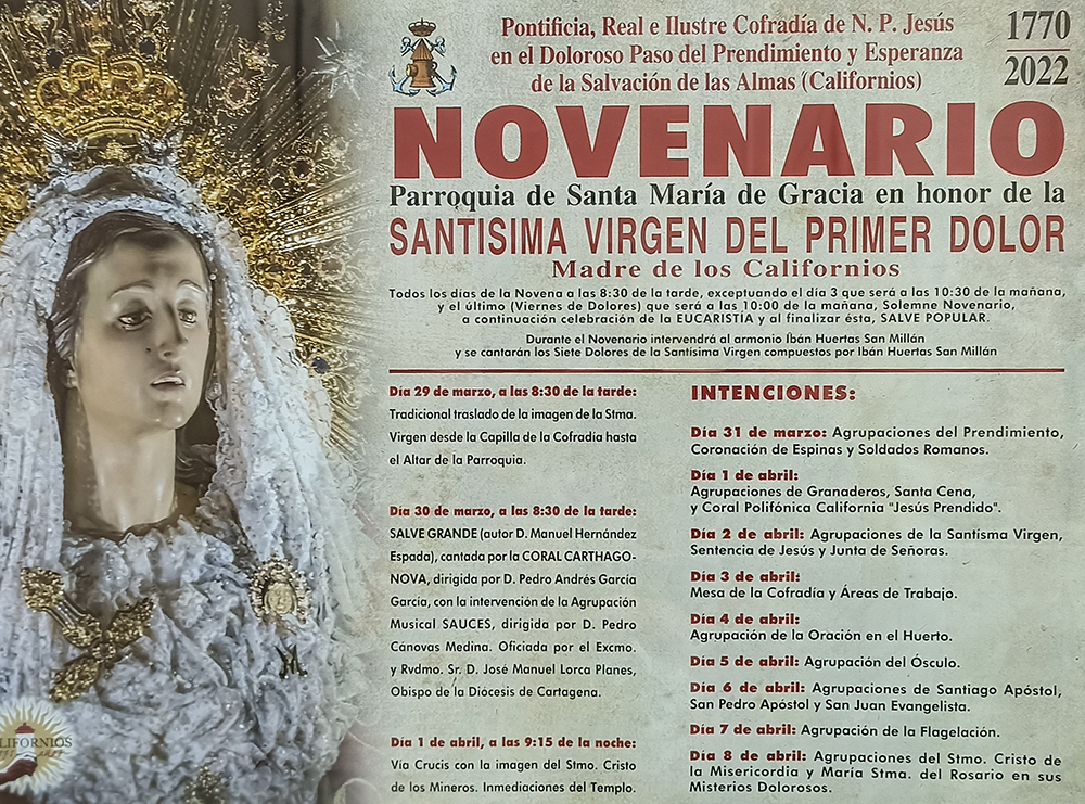 Los actos en honor a la Virgen del Primer Dolor se desarrollarán del 29 de marzo con el traslado de la imaen, para el miércoles tener lugar la Salve Grande, que será presidida por el obispo de la diócesis, Lorca Planes, y que contará con el apoyo musical de la coral Carthagonova y de la agrupación musical Sauces. El uno de abril se llevará a cabo el vía crucis del Cristo de los Mineros por las calles del entorno de Santa María y hasta el 8 de abril tendrá lugar las mismas de las agrupaciones.