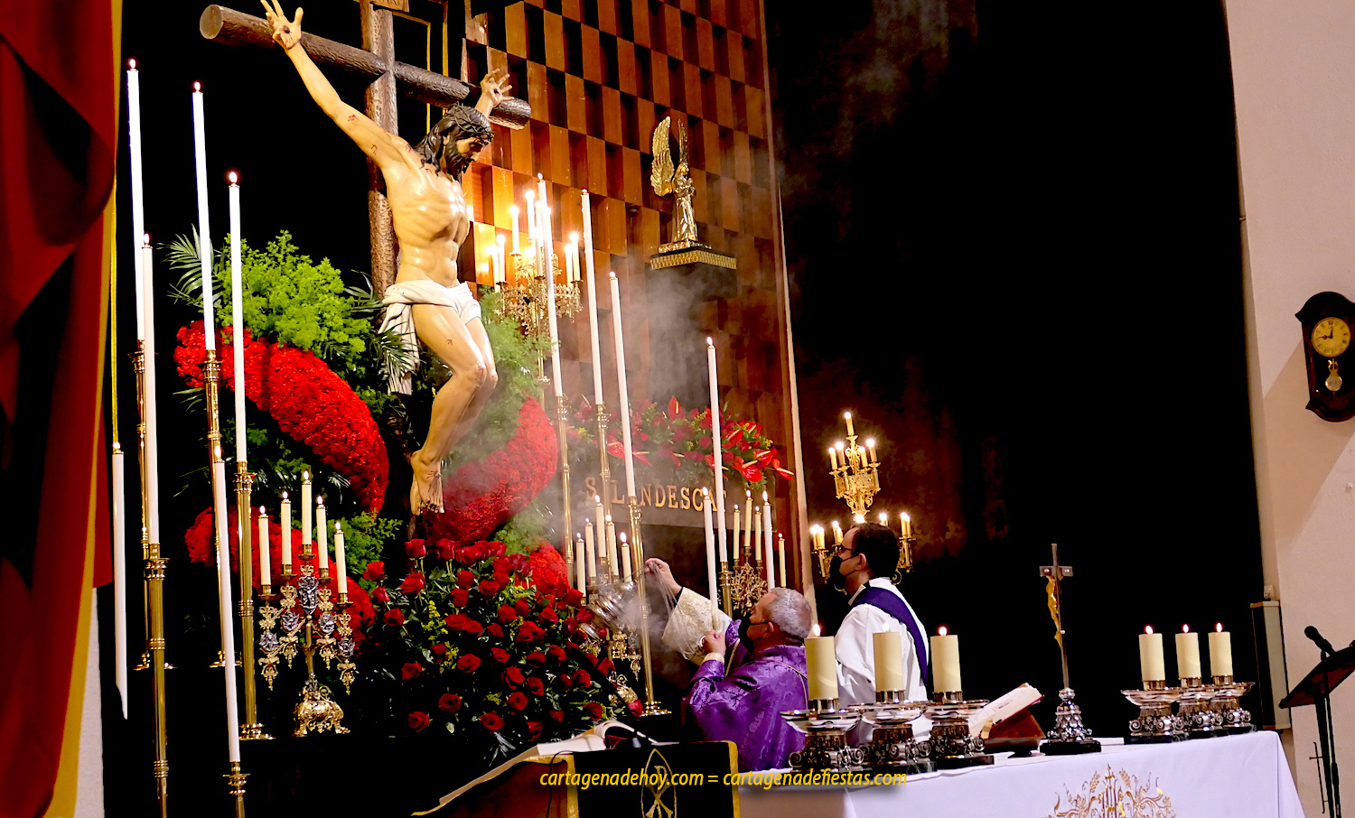 Con los cuatro hermanos mayores sentados ante el altar, el acto litúrgico comenzó con la lectura, a tres voces, del evangelio de San Juan, para después escuchar a Lázaro Gomariz relatar el 'camino de la cruz' ("avanza lento, como un faro luminoso que ilumina oscuridades y siembra esperanzas") del crucificado en la madrugada del Viernes de Dolores. "Señor del Socorro, esta ciudad te espera, ya por mucho tiempo, parea iniciar de nuevo la mejor Semana Santa que jamás nadie podrá vivir (...) Descontando los días para verte, Socorro de Cartagena, este año más que nunca, acompañado pro tu madre".