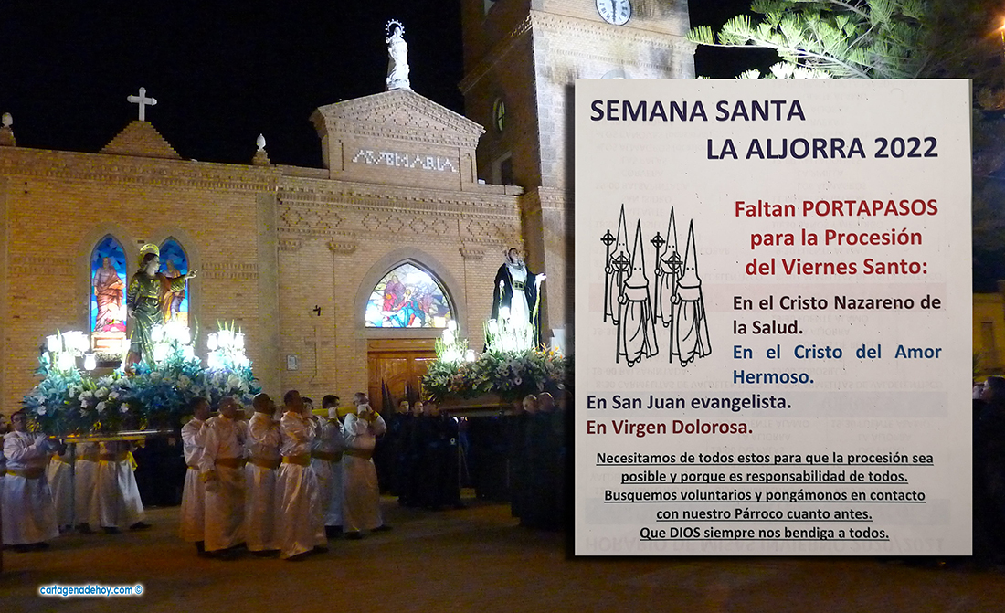 Fue duro para la asociación procesionista de El Algar suspender una procesión con tres tronos que no se celebra desde 2019 y en La Aljorra son claros en el mensaje difundido a los vecinos de cara a su Viernes Santo: “Necesitamos portapasos para cuatro tronos para que la procesión sea posible y porque es responsabilidad de todos. Busquemos voluntarios y pongámonos en contacto con nuestro párroco cuanto antes”, refleja el cartel de este llamamiento para Cristo Nazareno de la Salud, Cristo del Amor Hermoso, San Juan Evangelista y Virgen Dolorosa.