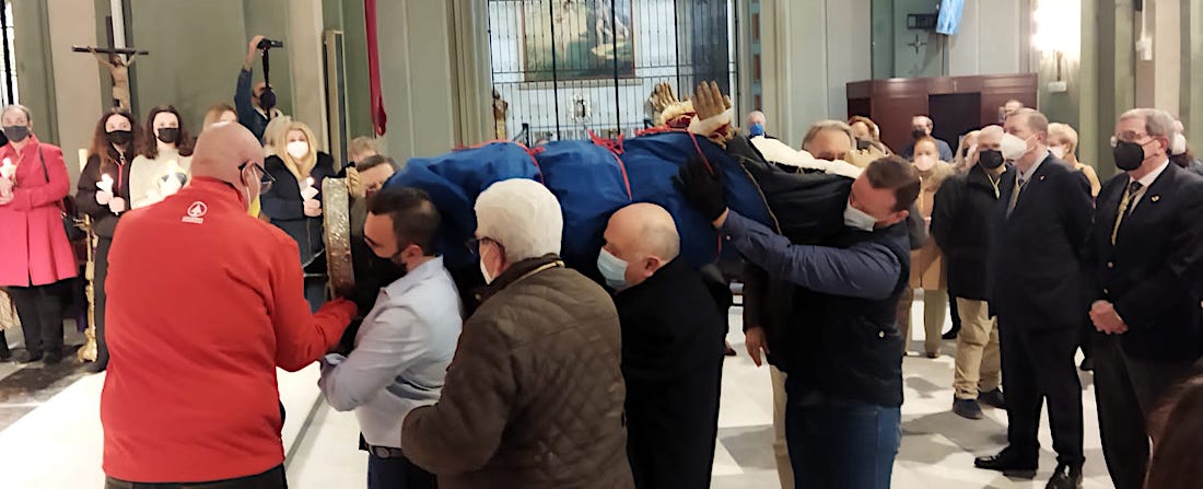 Los mayordomos de más edad de la Cofradía California, junto a los miembros de los equipos de guardalmacén e iglesia, tuvieron el privilegio de portarla a hombros hasta el lugar del altar en el que hoy presidirá la Salve Grande.