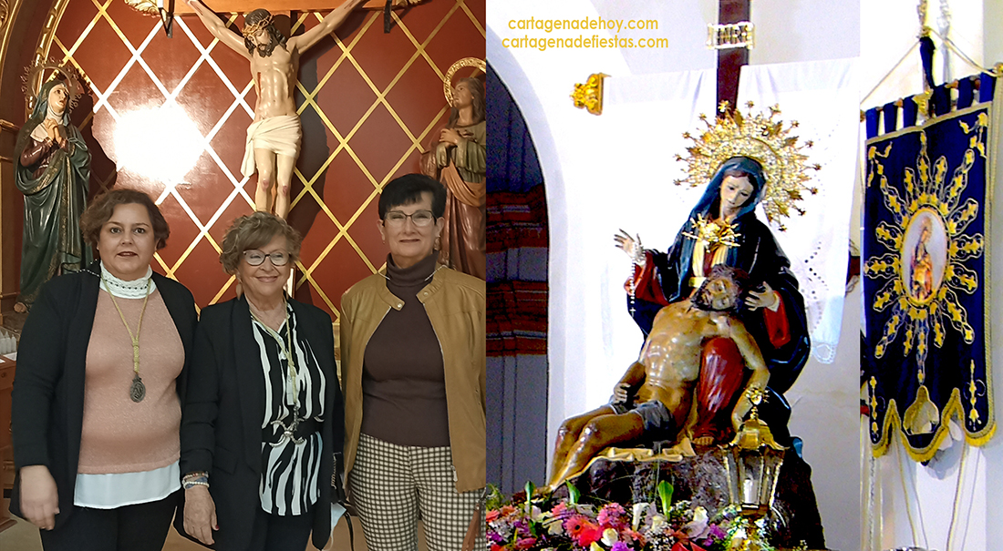 La concejala de Educación será la que anuncie las procesiones de su pueblo nativo este viernes, a las 19 horas, jornada en la que también tendrá lugar el traslado de la imagen de la Virgen de la Caridad, que volverá a salir en procesión el Viernes de Dolores. En la imagen se observa a la hermana mayor de la cofradía, Juana Sánchez Martínez, con Josefa Soriano y Ana Navarro, respectivamente, secretaria y hermana vara.