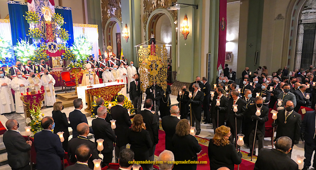 La Cofradía California ha celebrado en una abarrotada Santa María su principal acto litúrgico de cuaresma dedicado a la Virgen del Primer Dolor, que ha sido concelebrada por varios sacerdotes, con el obispo de la diócesis de Cartagena, José Manuel Lorca Planes presidiendo. En su homilia, ha pedido a los presentes mirar a María, “pues en ella vemos la ternura y el cariño de los fuertes, no de los débiles”, ha dicho, añadiendo más tarde que ella “fue madre, discípula y maestra en la oración; es fuente de esperanza y alegría”, reiterando varias veces la siguiente petición: “Madre, regálanos tu mirada”, matizando que su mirada “no se compra, es un regalo que nos hace más hermanos y solidarios”.