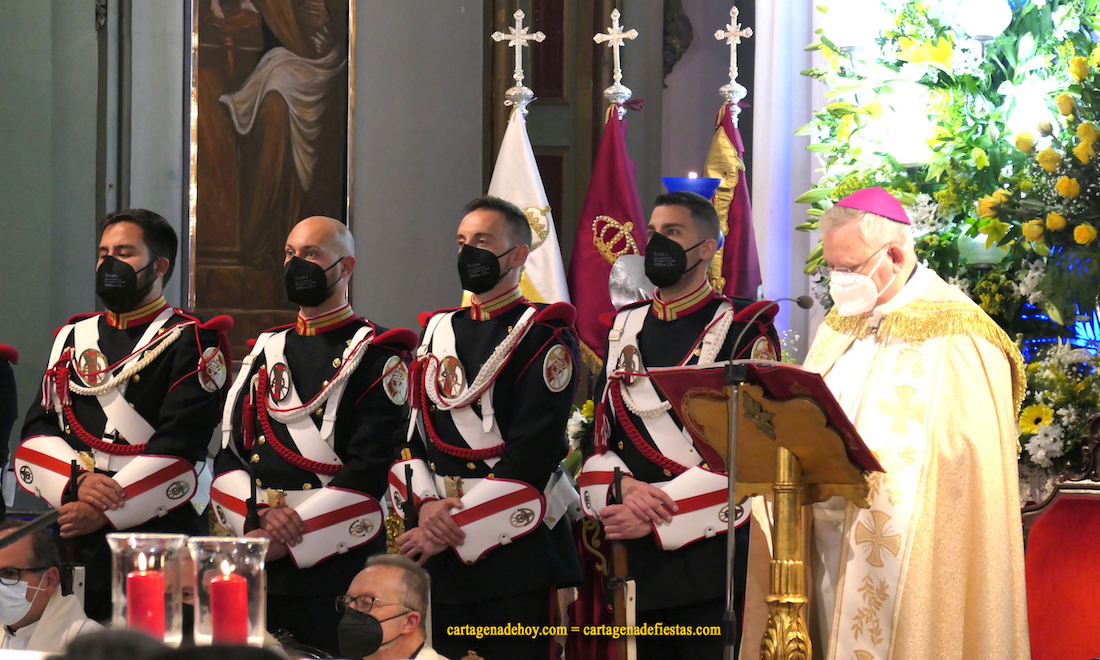 A la hora de inicio del oficio, los presentes se han dirigido hacia la imagen de la Virgen del Primer Dolor, ubicada en un monte floral y con puñal de estreno, para cantarle la Salve, tras la cual ha concluido la Salve Grande, iniciándose una procesión claustral de recogida desde el altar hasta la capilla california, cerrando los fusileros de la agrupación de Granaderos la comitiva. Reseñar que la agrupación musical Sauces y la coral Carthagonova, bajo las respectivas direcciones de Pedro Cánovas y Pedro Andrés García, han puesto el capítulo religioso al acto californio.