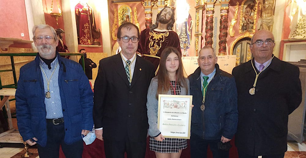 La agrupación california, ha entregado, después de la misa celebrada dentro del programa del novenario a la Virgen del Primer Dolor, el nombramiento a la joven de trece años de edad, quien forma parte de la procesión del Domingo de Ramos desde los seis años y que este año se estrenará en el tercio femenino que desfila el Viernes de Dolores, además de como volante en el tercio mayor de la más antigua de las agrupaciones de la Cofradía del Cristo del Prendimiento.