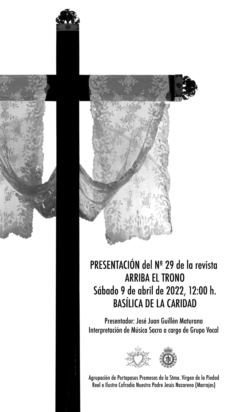 El próximo sábado 9 de abril, tendrá lugar la presentación de la revista "Arriba el Trono" de la mano de la Agrupación de Portapasos Promesas de la Stma. Virgen. La cita será a las 12 horas en la Basílica de Nuestra Señora de la Caridad donde D. Juan Guillén Maturana presentará la edición nº 29 de esta revista que, además, contará con la interpretación de Música Sacra a cargo de "Grupo Vocal".