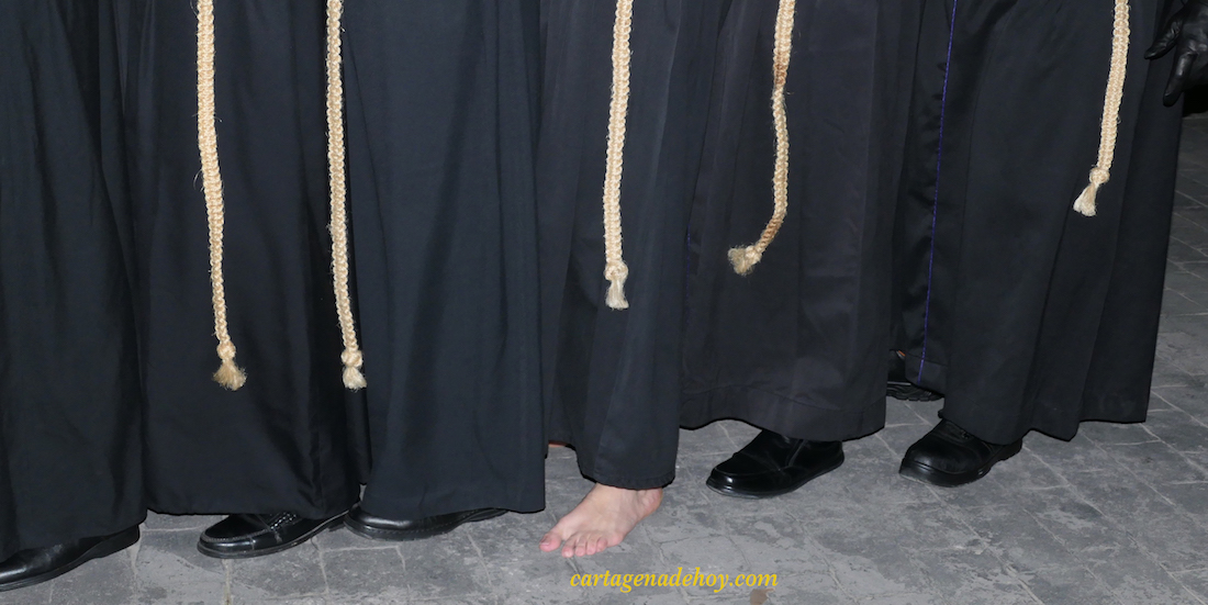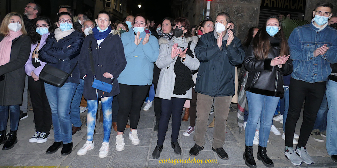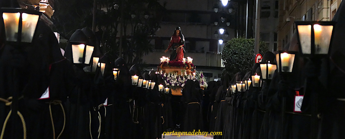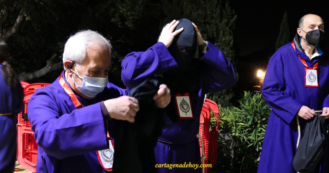 Se ha puesto en marcha a las tres y media, sin el habitual cohete, que ha tardado diez minutos en hacerse sonar en el cielo. Ello no ha restado valor a que el momento tan ansiado había llegado para cerrar el paréntesis de inactividad que comenzó en la madrugada del Viernes Santo de 2019. La Semana Santa de Cartagena ha vuelto con enorme ilusión y, quizás, más ganas que en mucho tiempo. Por cierto, damos fe de que en todo momento se cuidaron las medidas de seguridad sanitaria. Hasta los penitentes con capucha llevaron mascarilla y era obligatoria para todos los de la comitiva, incluidos los medios de comunicación.
