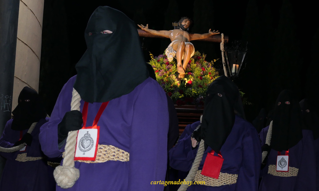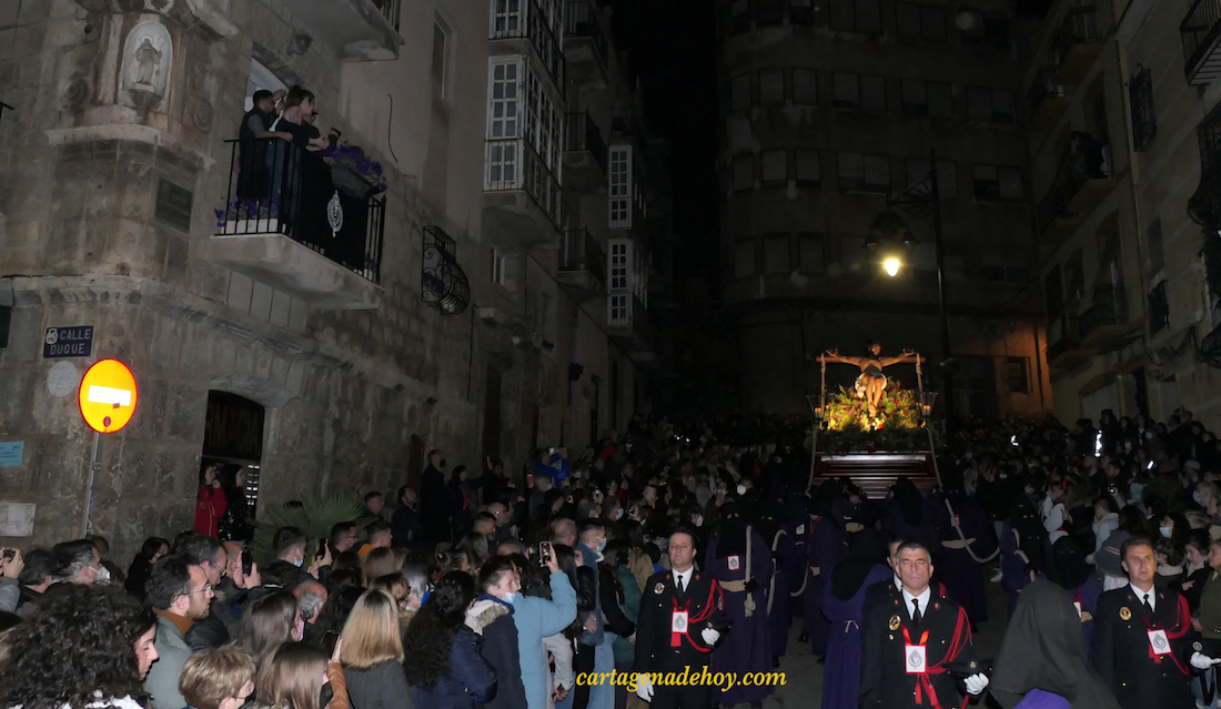 Catorce paradas en el camino de la cruz. El capellán de la hermandad, Lázaro Gomariz, da voz a la primera. “Es condenado el inocente… Es más fácil condenar que perdonar”. Suceden las siguientes paradas litúrgicas con otras voces. “Jesús carga con nuestra cruz, cargada con nuestros defectos” (segunda), “Jesús cae por primera vez” (tercera), “Jesús encuentra a su madre… entonctermos en este mundo el amor de una madre” (cuarta) y “El cirineo carga con una cruz que no es la suya…” (quinta). El siguiente alto es ante la entrada de Santa María. Allí espera la patrona de Cartagena en aquel siglo XVII que vio nacer a la Cofradía del Cristo del Socorro. Con los dos tronos encarados hacia ella, recibe como regalos tres ramos de flores (de la cofradía y cada uno de los grupos de damas de las dos agrupaciones) y la primera Salve procesionista de este año.