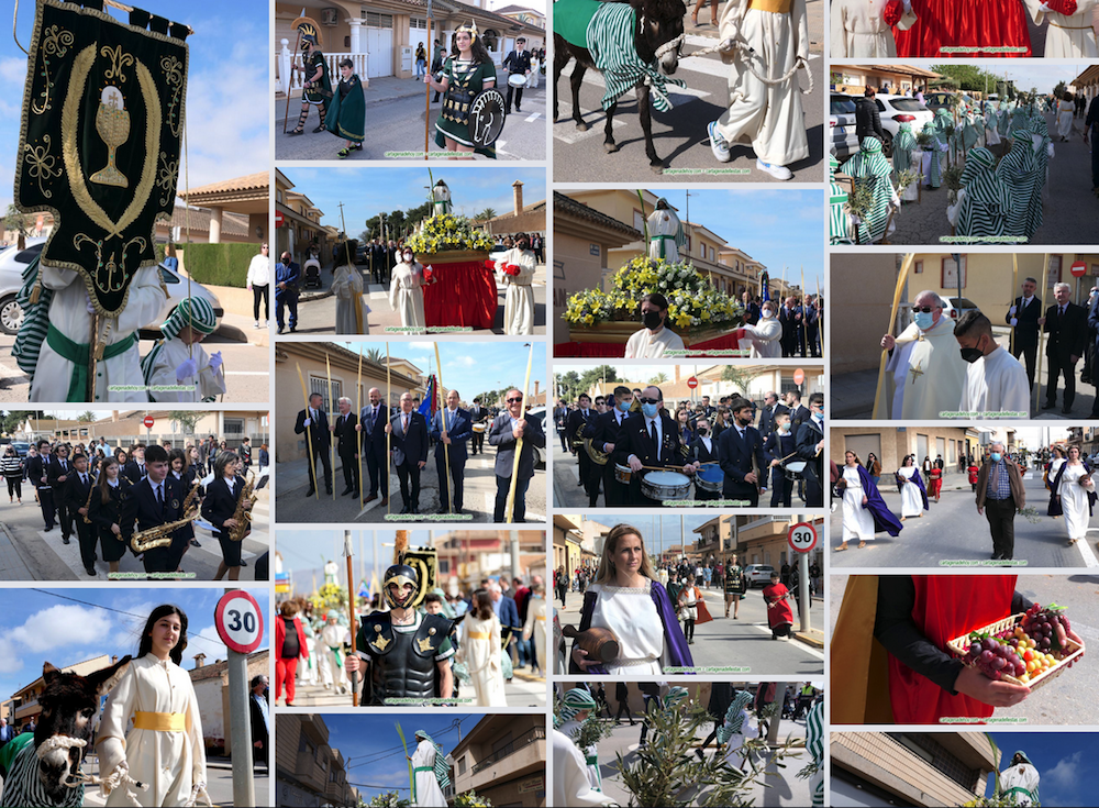 La semana de Pasión regresó a La Puebla con su singular procesión del Domingo de Ramos, que partió de la iglesia con un cortejo encabezado por los tamboristas y un burro de nombre ‘José’. A continuación, cuatro mujeres túnicas romanas con ánforas en sus manos, tres romanos de la Legión de Sagunto y el tercio de chavales en formación procesionista con sus atuendos verde y blanco, al igual que la pequeña talla de Jesús, que cumple 23 años desde que llegó a esta tierra, y que fue llevado en trono a ruedas. Tras el párroco, don Emilio, la comitiva de honor integrada, entre otros, por el teniente de alcalde Manuel Padín y los concejales Diego Ortega y Enrique Pérez, además del hermano mayor de la cofradía, José Fernández, y el presidente de la junta vecinal, Juan Manuel Ayaso. Cerraba la banda de música.