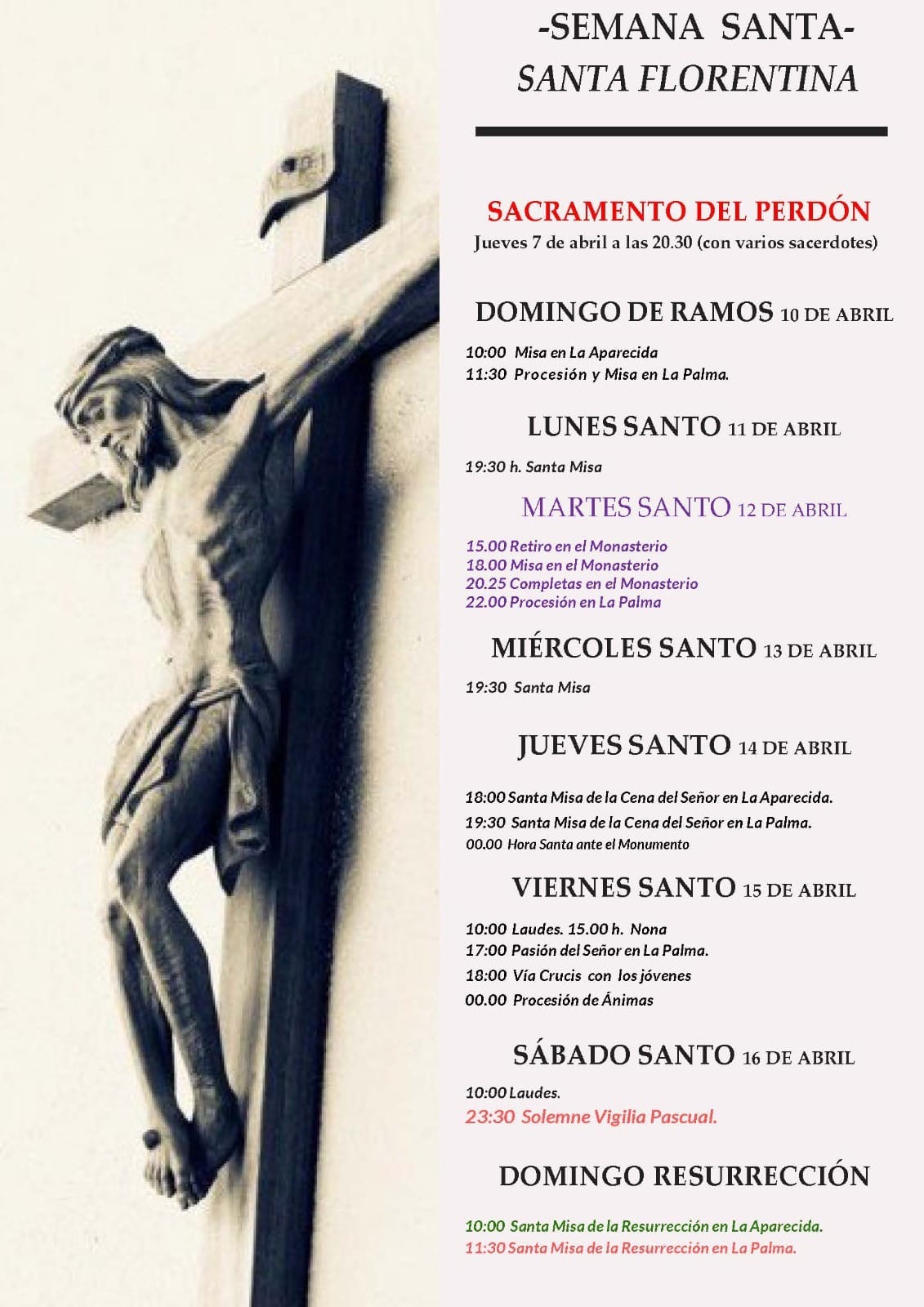 La actividad de Semana Santa en la parroquia de Santa Florentina se intensifica en la jornada de hoy con diversos actos en el retiro que comenzará a las tres de la tarde en el monasterio cisterciense de ‘Nuestra señora de la paz’, para por la noche, a partir de las diez comenzar desde la iglesia el desfile pasionario con la Virgen de la Soledad y Cristo crucificado que, con acompañamiento de saetas, recorrerá el pueblo.