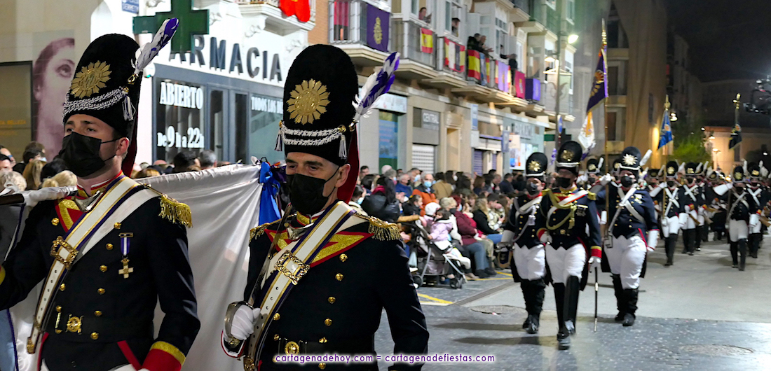 A continuación, desfilan los Granaderos Cadetes de la Agrupación de Granaderos. A imagen del tercio de granaderos con similar disposición, paso y uniforme, la cantera marraja ofrece una imagen típica de las procesiones cartageneras. Su origen data de comienzos del siglo XX, y se inspira en los cadetes de las academias militares, por lo que estos niños llevan en su totalidad galones de oficial de Infantería de Marina.
