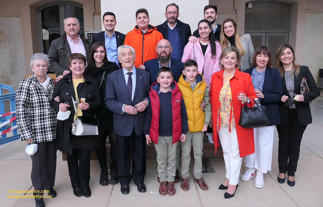 Benito Martínez Escolar vivió una tarde muy especial el sábado con el Cabildo de las monas, en el que recibió la insignia de honor de la Cofradía del Resucitado por sus 75 años de trayectoria con la hermandad. Quien fue durante 16 años el hermano mayor estuvo arropado esa jornada por una amplia representación de su familia.