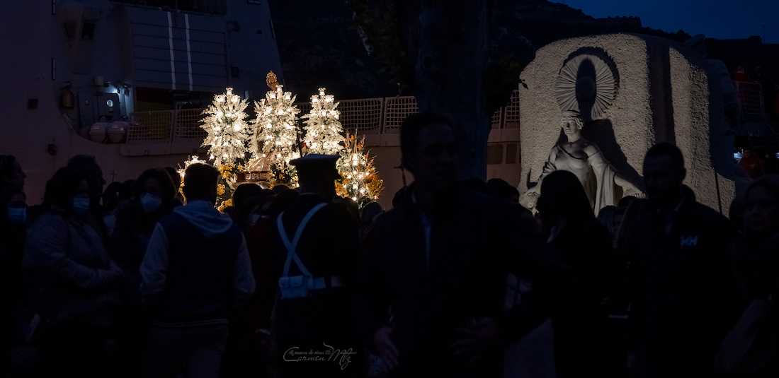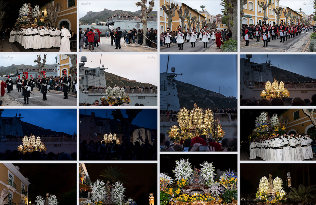 La fotógrafa cartagenera ofrece escenas captadas en el interior del Arsenal de los actos previos que llevó a cabo la Armada Española con el apóstol californio, además de su salida por la puerta de la instalación militar para recorrer la ciudad.