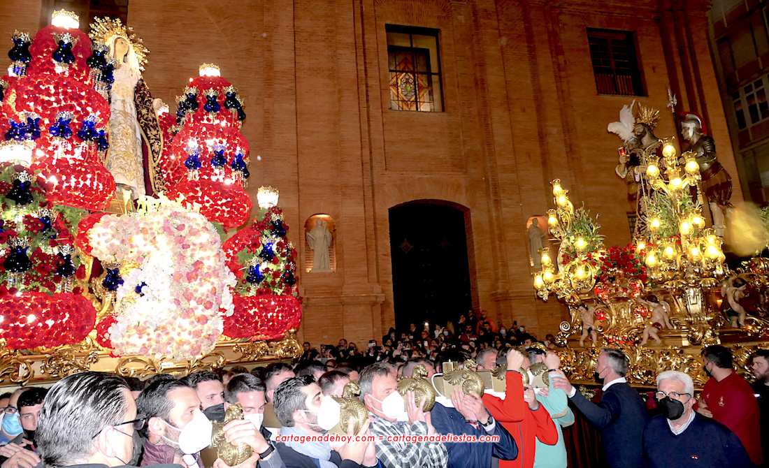 No hubo procesión debido a que la lluvia que obligó a cerrar de forma precipitadas las procesiones en la Cartagena de 2019 no ha querido perderse la recuperación de estas señaladas fiestas. Esta vez los afectados con los californios, quienes apuraron opciones hasta que, finalmente, tuvieron que optar por la cancelación. Para suavizar ese lamento, decidieron llevar a cabo unos actos con el pueblo. Primero fue abrir a las 20 horas la iglesia para que se pudieran contemplar los tronos con la iluminación encendida, como cuando están en la calle. Estas imágenes las hemos añadido al artículo de la ‘Procesión estática del Miércoles Santo’: pinchar aquí