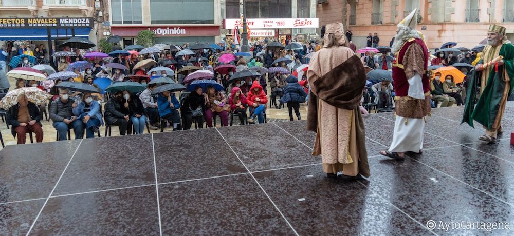 Esta vez, Poncio Pilatos no pudo el contenido de la palangana (donde se lavó las manos) al público, como es tradicional. Fue el cielo el que descargó la lluvia sobre intérpretes y espectadores a los pocos minutos de empezar la representación de la tarde del Miércoles Santo en el escenario de la plaza del Ayuntamiento de Cartagena, por lo que hubo que suspender.