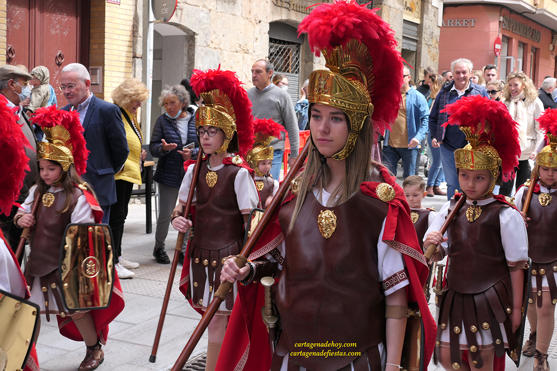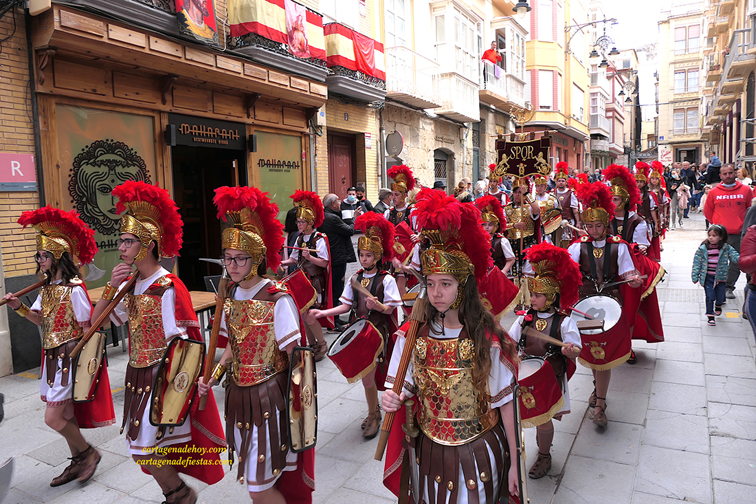 Granaderos y romanos, principalmente, han animado las calles del casco urbano de Cartagena, al margen de las procesiones, con diversos pasacalles, que se han convertido en atractivos alicientes para los visitantes que recibe la ciudad. En la imagen se observa a la sección infantil de los ‘judíos’ californios en la mañana del Jueves Santo.