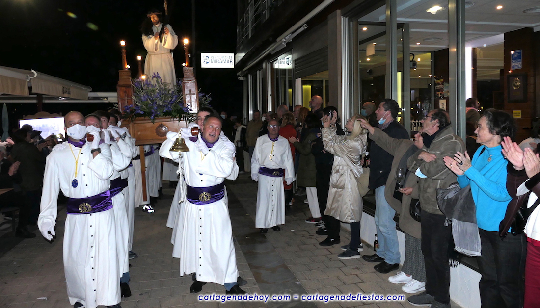 El encuentro es el habitual, el de siempre, pero diferente a cuando tenía lugar ante la iglesia. Los respectivos portapasos encaran los tronos de Cristo Crucificado y de la Virgen mientras se escucha una saeta, se canta la Salve y suena el himno de España, además del sonido de caracolas y de las olas rompiendo con fuerza (hacía viento en esa zona) en el rompeolas, a escasos metros de donde estaban tallas, procesionistas y público, además de las personalidades, entre las que figuran la alcaldesa, Noelia Arroyo, junto al teniente de alcalde, Manuel Padín, y las ediles Cristina Pérez y Mercedes García, y la consejera autonómica Isabel Franco. Nombre propio de la noche fue ‘Loli, la Mojaquera’, cantaora de Isla Plana, que ofreció cuatro saetas jalonadas durante el recorrido.