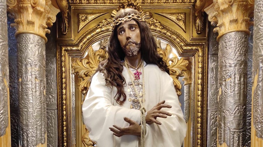 Para tan importante celebración de la Misericordia Divina, la talla del Cristo atribuida al escultor Francisco Salzillo, ha sido vestido con una túnica de color blanco roto de raso salvaje, donada por Manolo, el anticuario de la calle Caballero.