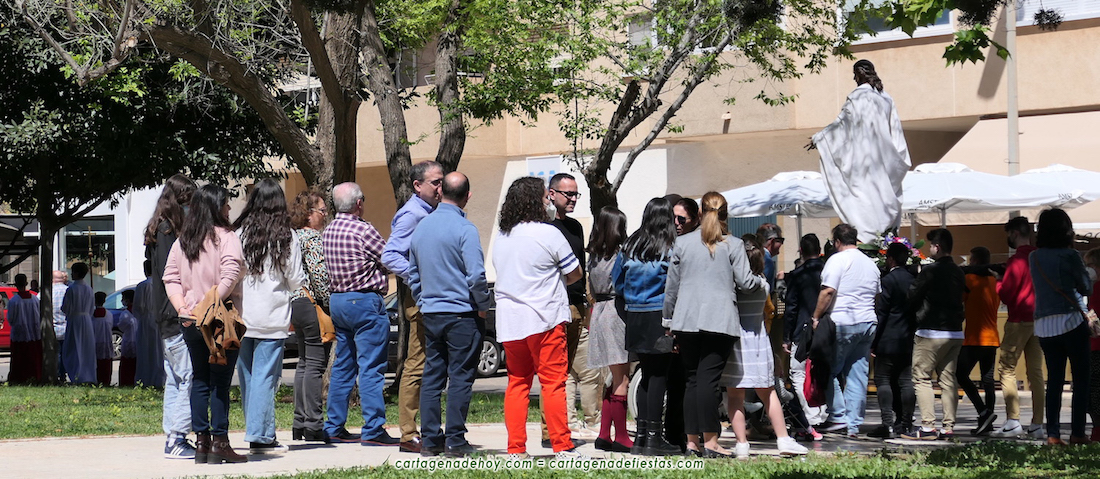 El 27 de abril de 2019 regresaba el ‘Cristo del Sermón de la montaña’ al Polígono Santa Ana, donde se le rinde culto, tras salir en procesión. Sin embargo, la pandemia le provocó un ‘confinamiento’ que ha durado hasta que este pasado 10 de abril volvió a desfilar por el centro de la ciudad con el tercio infantil de la Coronación de Espinas. Ahora tocaba recuperar la procesión de regreso a su barriada y lo ha hecho en una soleada (casi veraniega) mañana y llamando la atención de numerosos vecinos de un núcleo de población con el que está totalmente enraizado y con el que su agrupación mantiene numerosos vínculos.