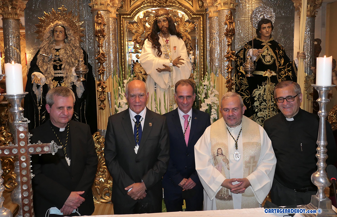El santísimo Cristo de la Divina Misericordia recibió la medalla de oro de 'Cartagena por la Caridad' en un solemne y emotivo acto celebrado tras una misa concelebrada por los capellanes de ambos colectivos religiosos y por el rector de María de los Desamparados, a quienes se observa en la foto junto a los presidentes de los dos colectivos vinculados, José Felipe Rubio y Matías Barco. Es la primera vez que una imagen recibe esta distinción, también considerada como "la medalla del amor", que se deseó que lleve la paz al mundo, especialmente en Ucrania.