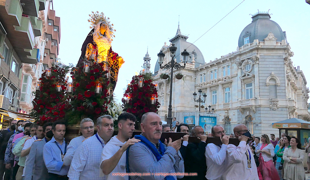 La comitiva fue pasando por las calles más centricas de la ciudad conforme iba apagándose la luz solar, culminado el acto con el canto de la Salve Cartagenera en la recogida.