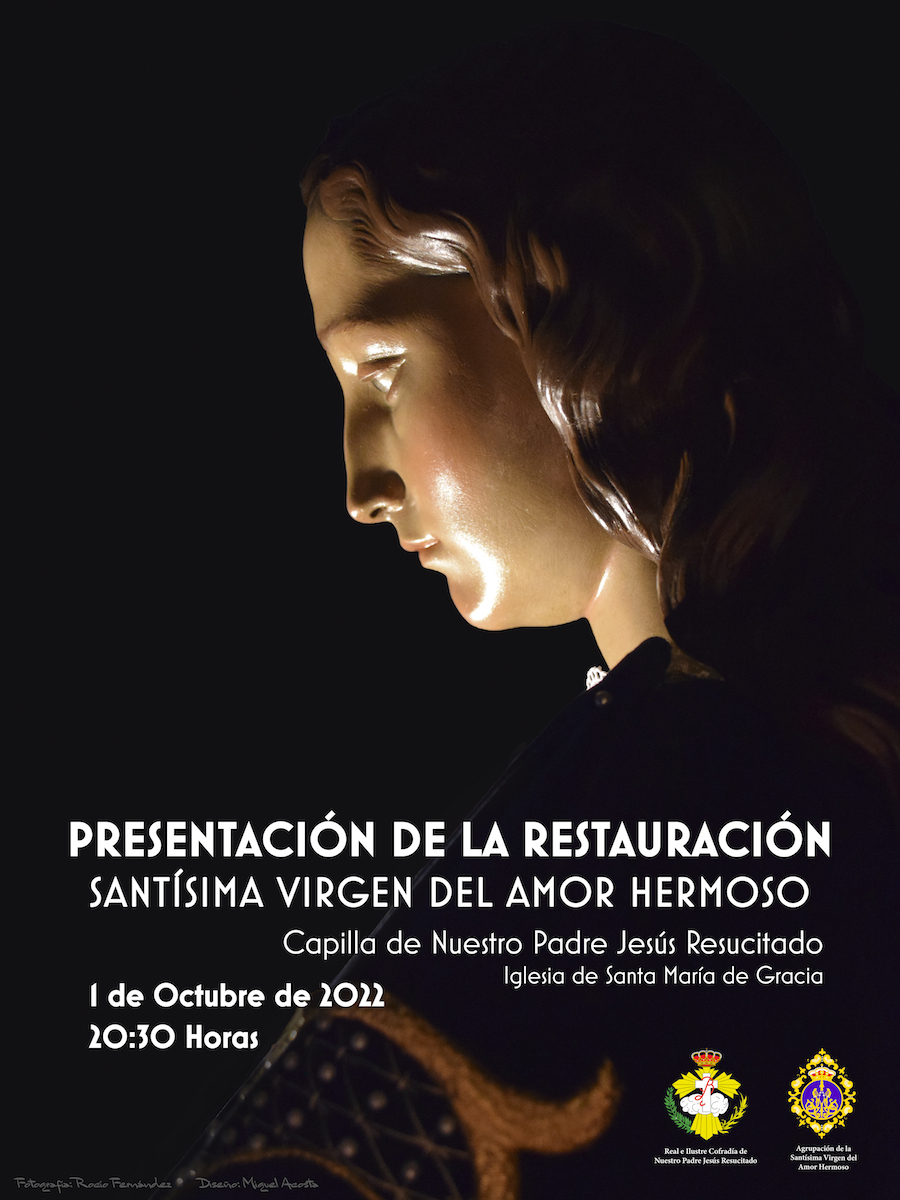 En el acto, en el que se realizará una presentación de la restauración llevada a cabo y se bendecirá de la imagen, está previsto que participen: la Hermana Mayor de la Cofradía, Marién García Boj; la restauradora Macarena Poblaciones; el presidente de la Agrupación Santísima Virgen del Amor Hermoso, Emilio Ros; y el cofrade Ginés Fernández Garrido.