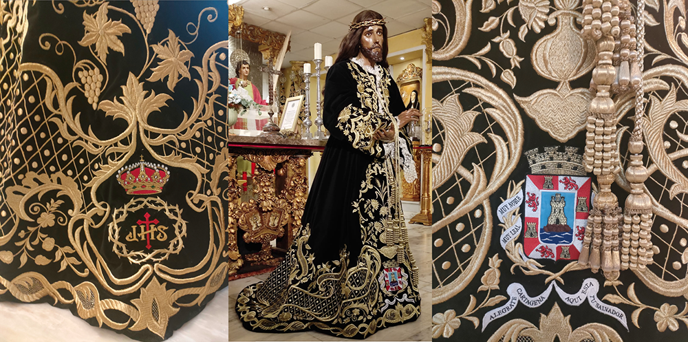 Luce una túnica nueva donada por cartageneros y devotos, confeccionada altruistamente por Maria Rosa Hernández Cazorla y bordada en oro sobre tercio pelo negro, por Jose Manuel Mejía, igualmente lleva, puntillas de encaje de bolillo realizada a mano en La Palma, y donadas por María del Carmen Marí.