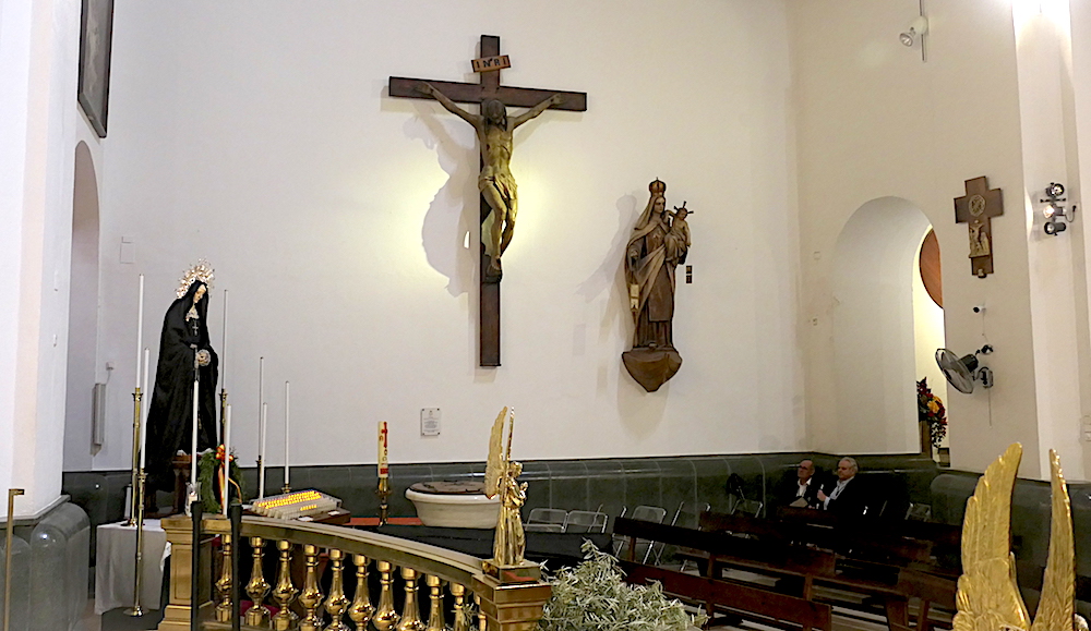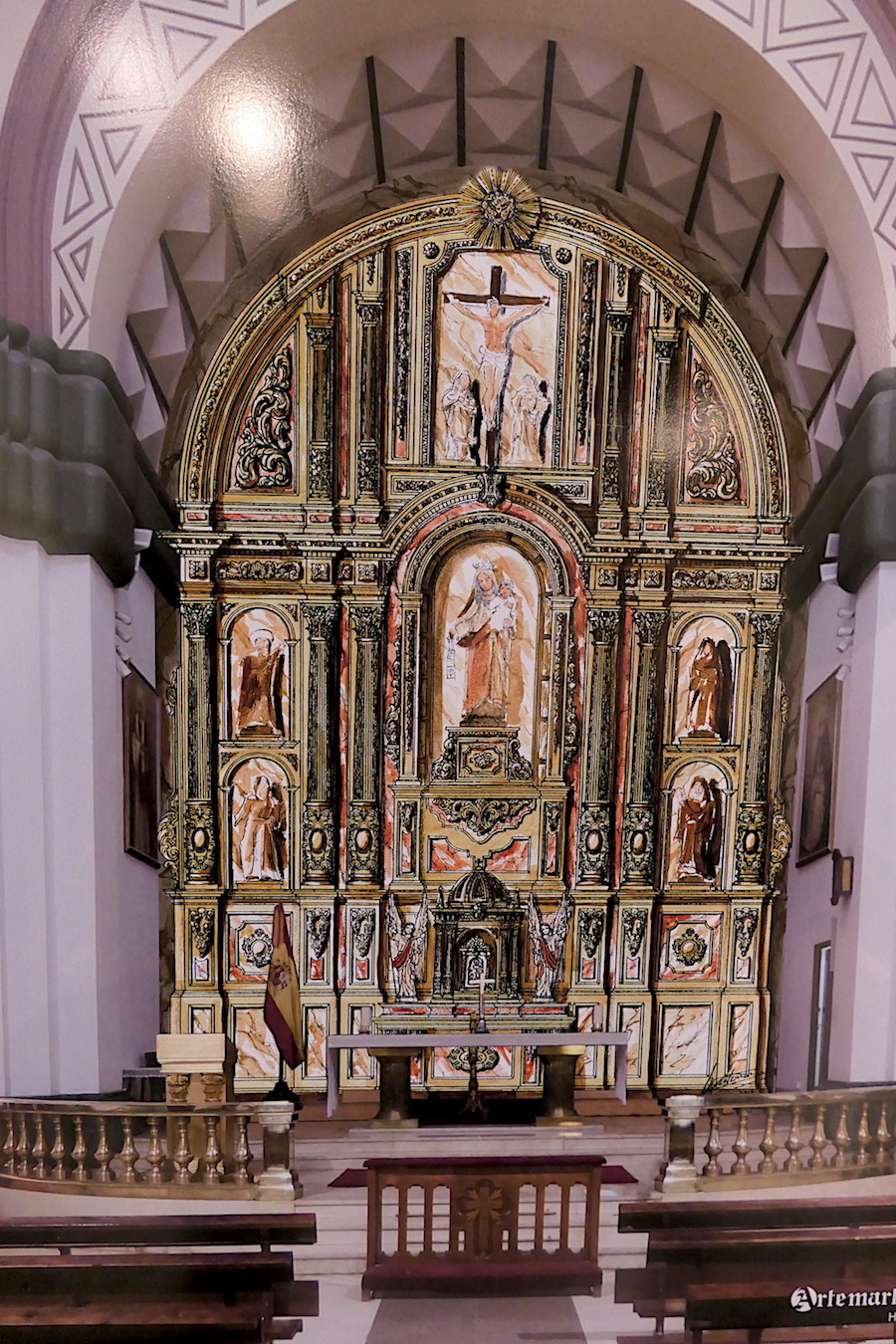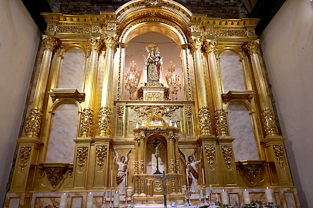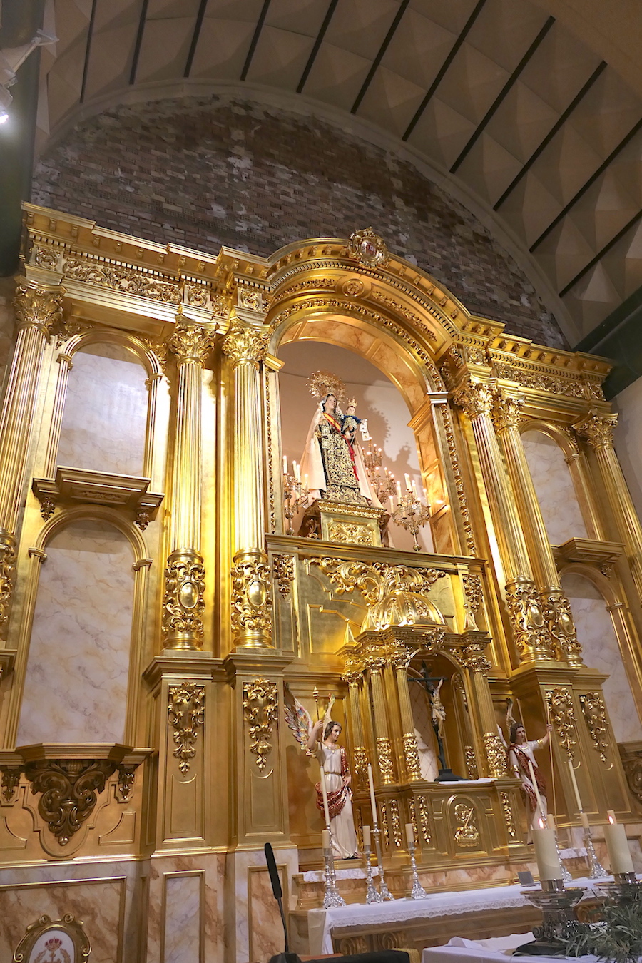 Cuando el visitante se adentra en la iglesia de Santo Domingo enseguida tiene la intención de asegurar que no se ha equivocado de edificio católico, pues hay un cambio radical que es de las primeras imágenes que llegan a la vista. La pared posterior al altar era antes de madera oscura y ahora ese espacio lo ocupa un reluciente retablo dorado que da más iluminosidad a toda la iglesia. En sus hornacinas ya se han ocupado la central, con la Virgen del Carmen, y la inferior, con un pequeño crucificado. Sus homónimos, que son dos estupendas tallas de madera completa, antes estaban en la pared y ahora destacan más sobre una pared clara en el lateral.