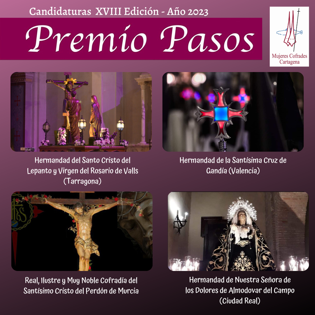 La Asociación Mujeres Cofrades de Cartagena quiere expresar su gratitud a las cuatro instituciones cofrades candidatas al Premio PASOS 2023 por su participación en esta iniciativa, y manifestar su reconocimiento a todas ellas por la ejemplar implicación en pro de la igualdad que todas desarrollan.
