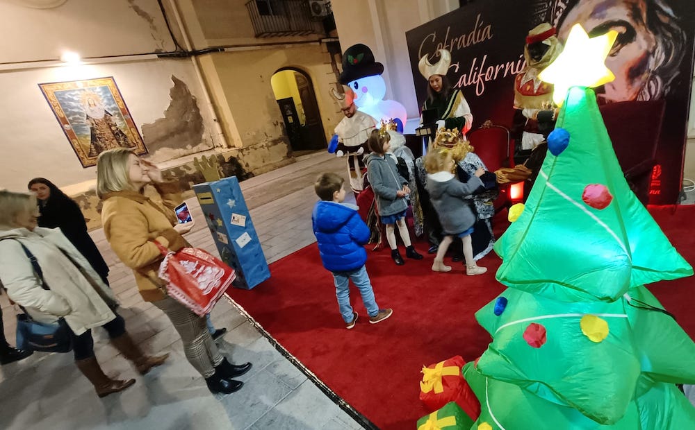 Melchor, Gaspar y Baltasar han llegado esta tarde ante la sede de la Cofradía del Prendimiento para un encuentro con los chavales dentro de la jornada de la campaña de recogida de juguetes para niños de familias necesitadas que ha organizado la hermandad.