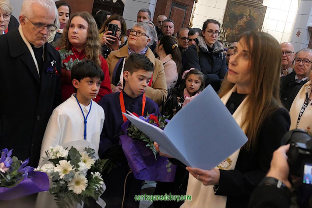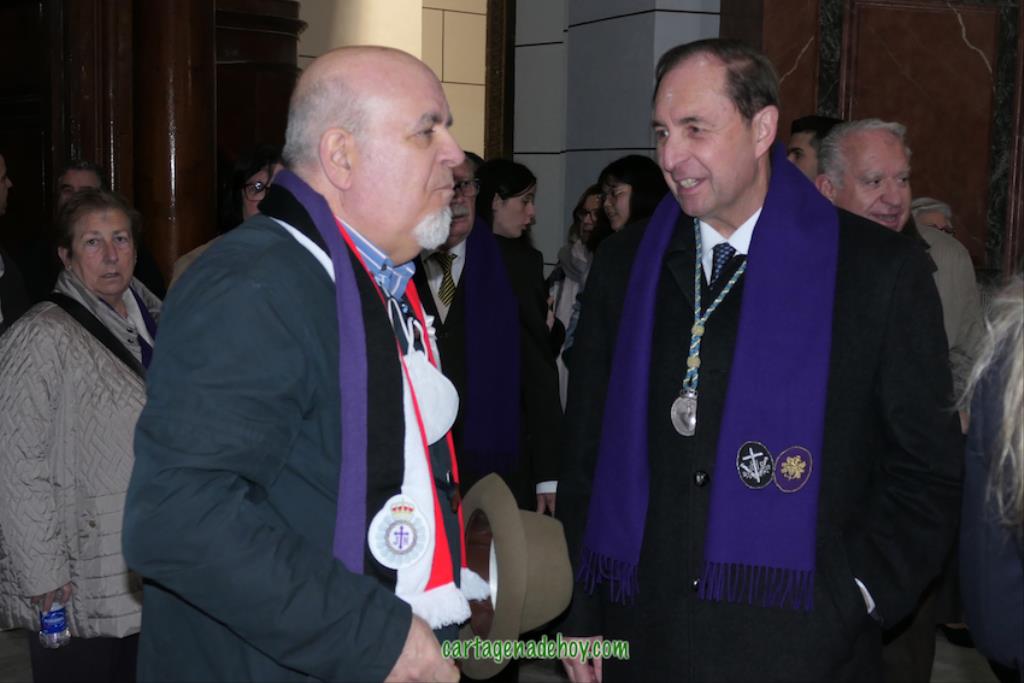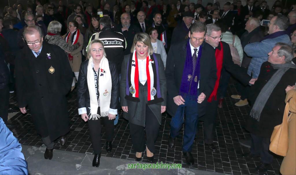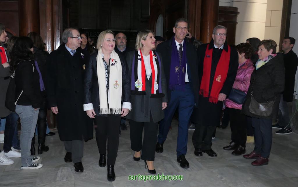 La marcha desde el Palacio Consistorial fue encabezada por la Agrupación 'Cartagena 1990' con el sonido de las piezas procesionistas musicales más alegres. Abrían paso a la alcaldesa, a los cuatro hermanos mayores, a la pregonera, al procesionista del año y a la nazarena mayor junto a una amplia representación de la familia cofrade, pudiéndose observar las bufandas de diferentes colores según la hermandad (morado, encarnado, blanco y negro), además de una 'cuatricolor' que representa a todas ellas y que ya está totalmente arraigada estos días.