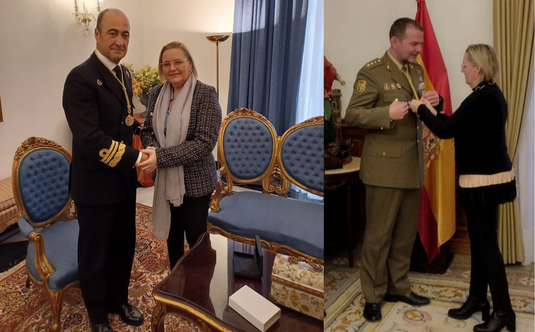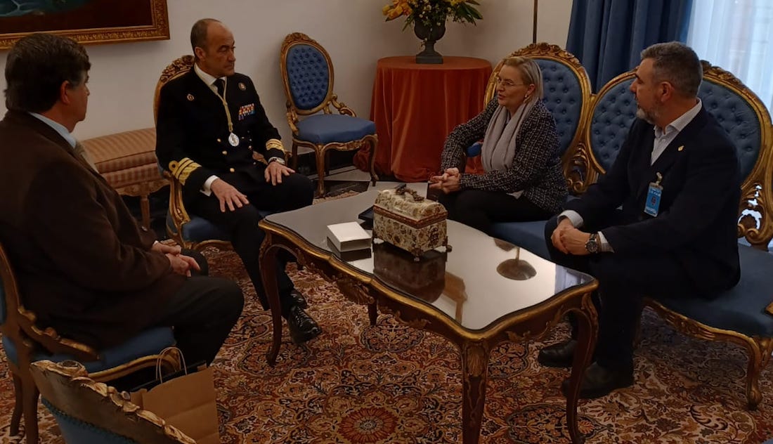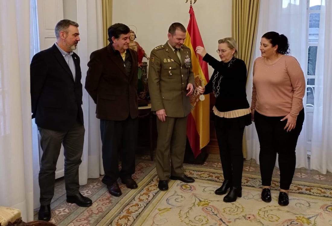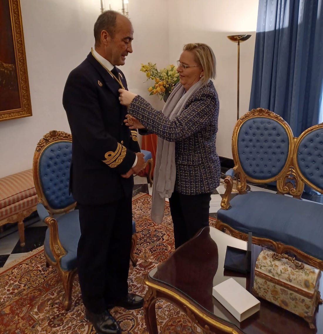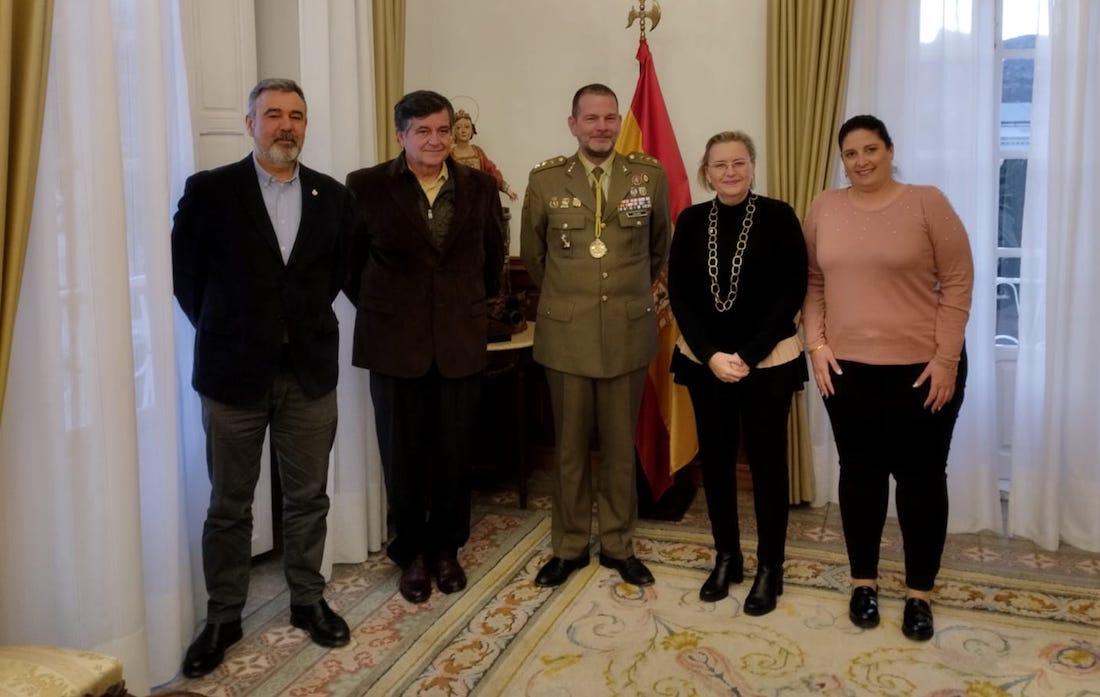 La Hermana Mayor de la Real e Ilustre Cofradía de Nuestro Padre Jesús Resucitado, Marién García Boj, ha visitado al Almirante de Acción Marítima (Almart), Alfonso Delgado, y al coronel entrante del Regimiento de Artillería Antiaérea 73 (RAAA 73), Carlos Quijano, para hacerles entrega de la medalla de la cofradía para que pueda utilizarla en los distintos actos organizados por el Resucitado durante la Cuaresma y Semana Santa.