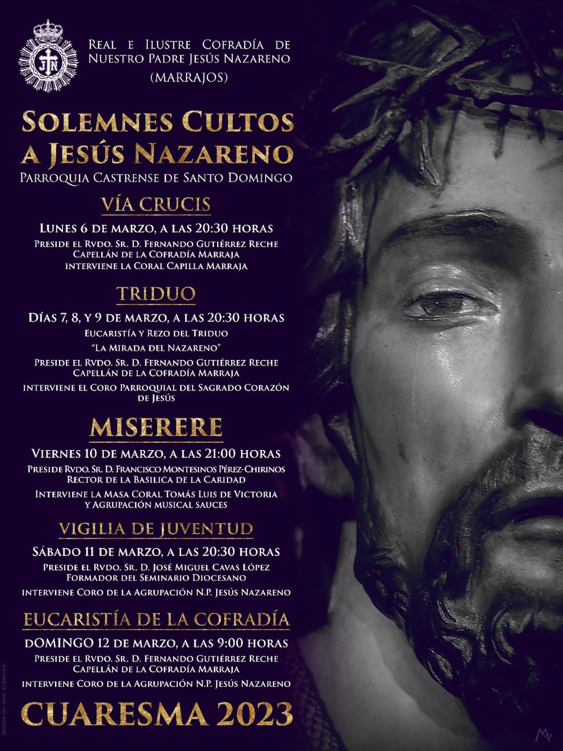 Tras la celebración del pregón de exaltación a la imagen, que fue ofrecido por Fernando Navarro Mulero, hoy, con un vía crucis claustral, se inician los actos centrales de la Cofradía Marraja en cuaresma en la iglesia de Santo Domingo. El viernes se celebrará el Miserere, que presidirá el rector de la Basílica de la Caridad, Francisco Montesinos.