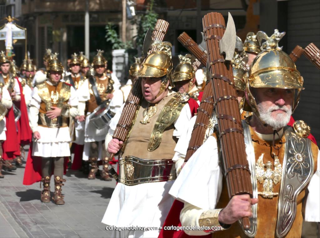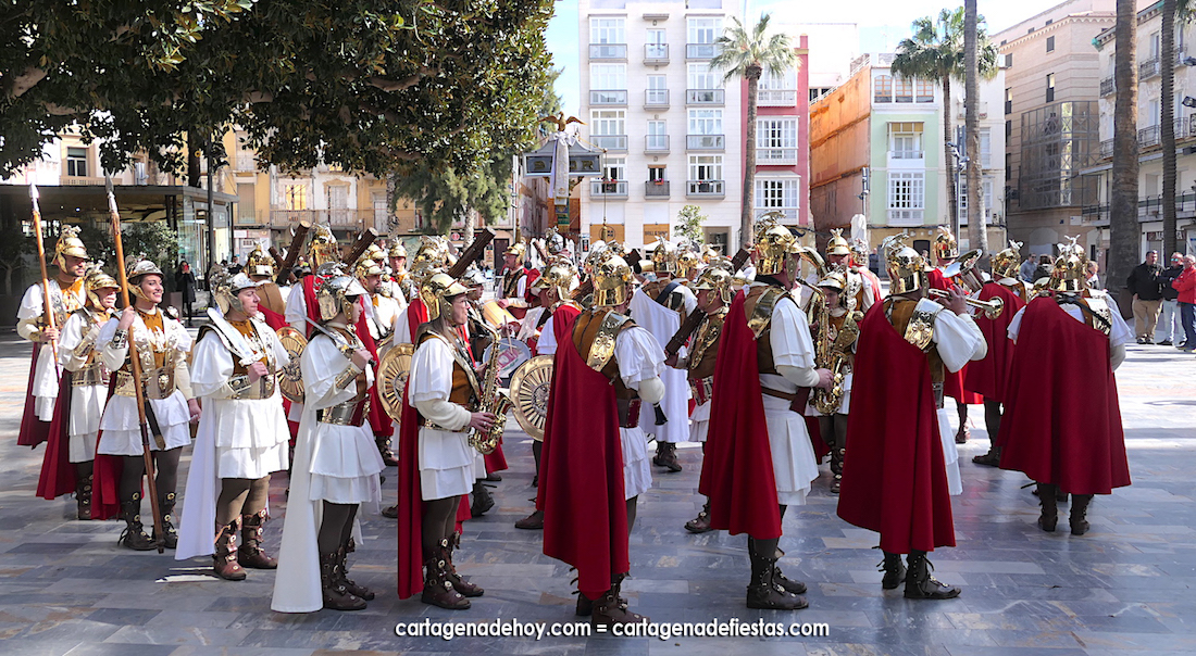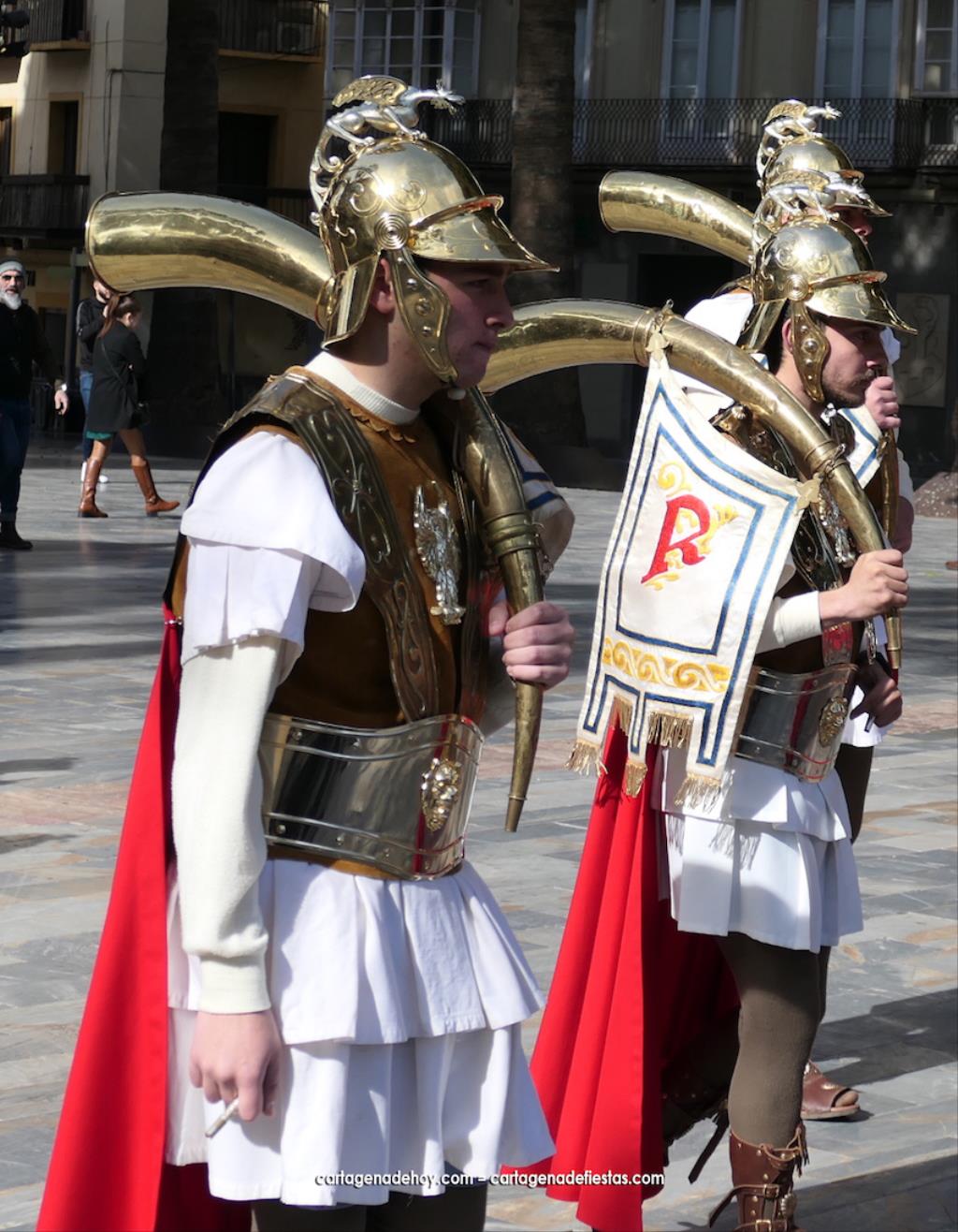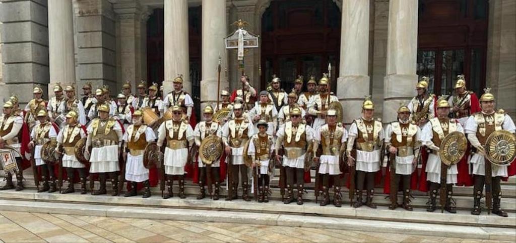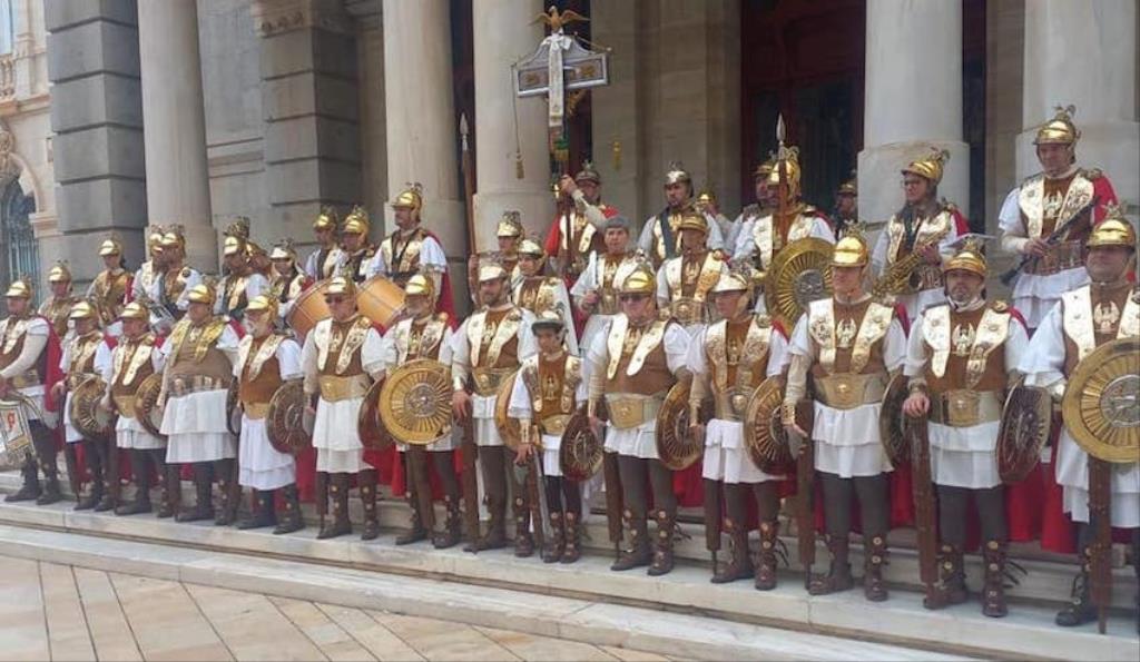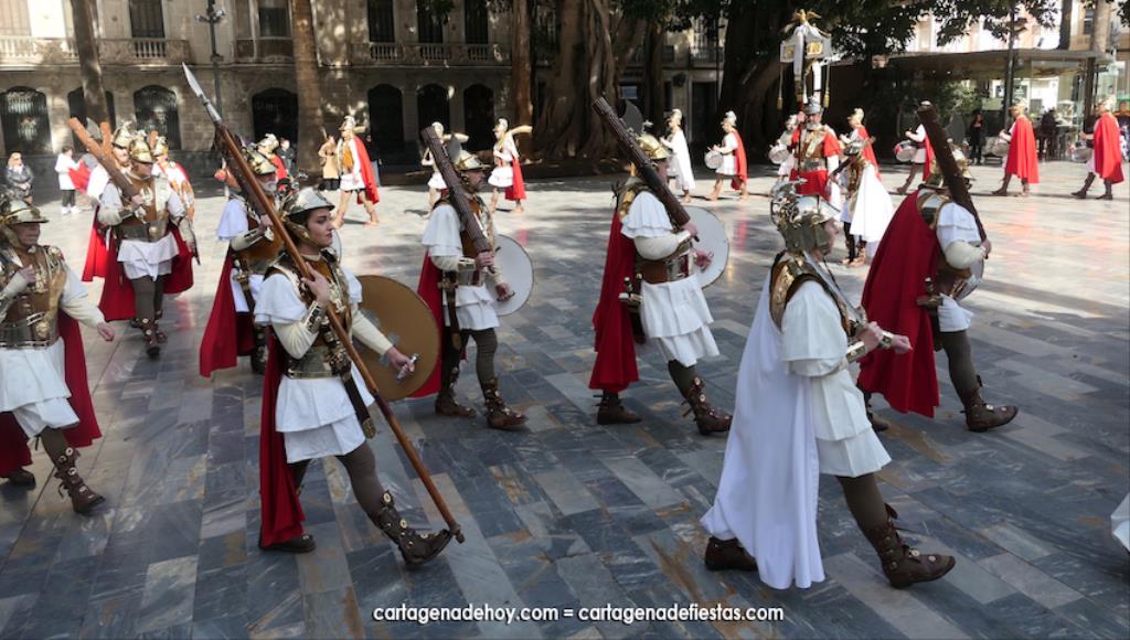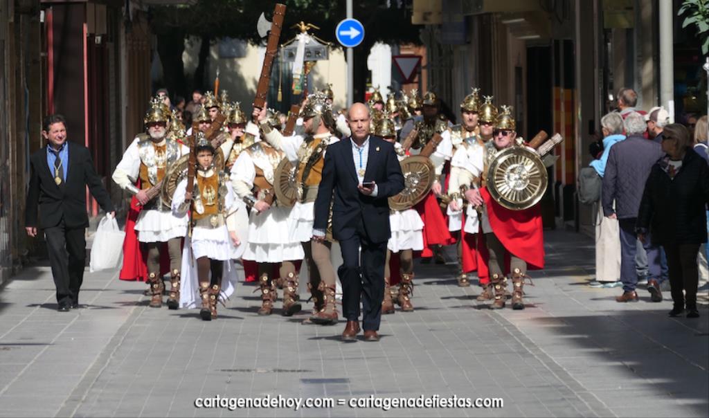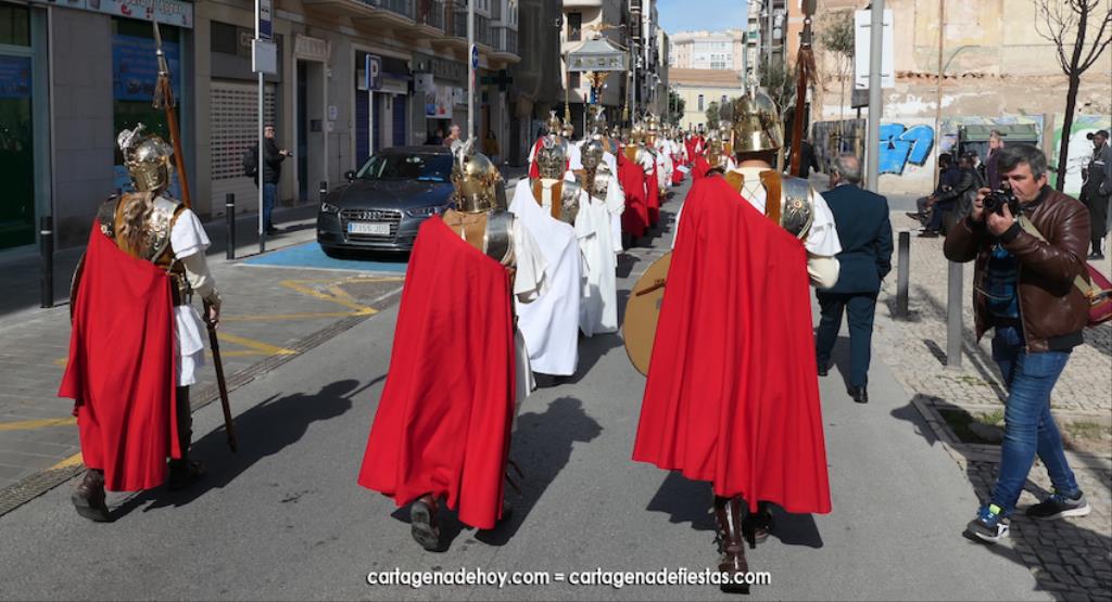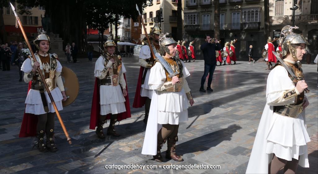 La Semana Santa de Cartagena tiene entre sus tradiciones que los soldados romanos y los granaderos de las cofradías salgan a la calle los domingos previos para anunciar la inmediatez de la procesiones. Los primeros en salir son los Soldados Romanos de la hermandad de Jesús Resucitado, siendo ayer el día elegido en este 2023. Había ilusión por volver a cruzar la ciudad con desfiles y ‘caracoles’, pero el inicio no fue el esperado, pues la salida se tuvo que retrasar por el paso por el casco antiguo de la media maratón y luego hubo problemas para tener el pórtico del templo de la patrona abierto, ya que la basílica está en obras y con el retraso ya había comenzado la misa en la capilla anexa. La cuestión es que ha final todo se solventó y se recuperó la normalidad, con ofrenda floral a la Virgen de la Caridad y posterior visita al asilo de ancianos del Barrio de la Concepción, además de la habitual foto en las escaleras del Palacio Consistorial con su atuendo identificativo de túnica blanca, peto marrón, capa rojo y el singular dragón en el casco.