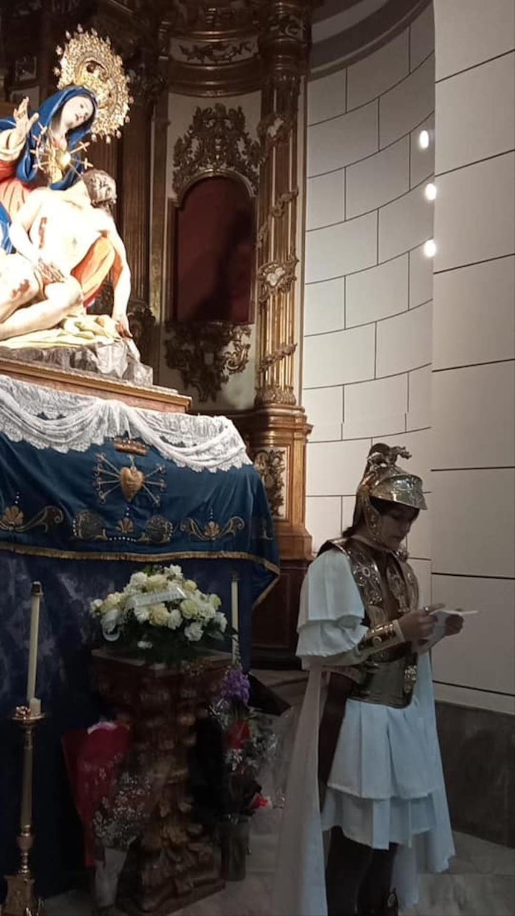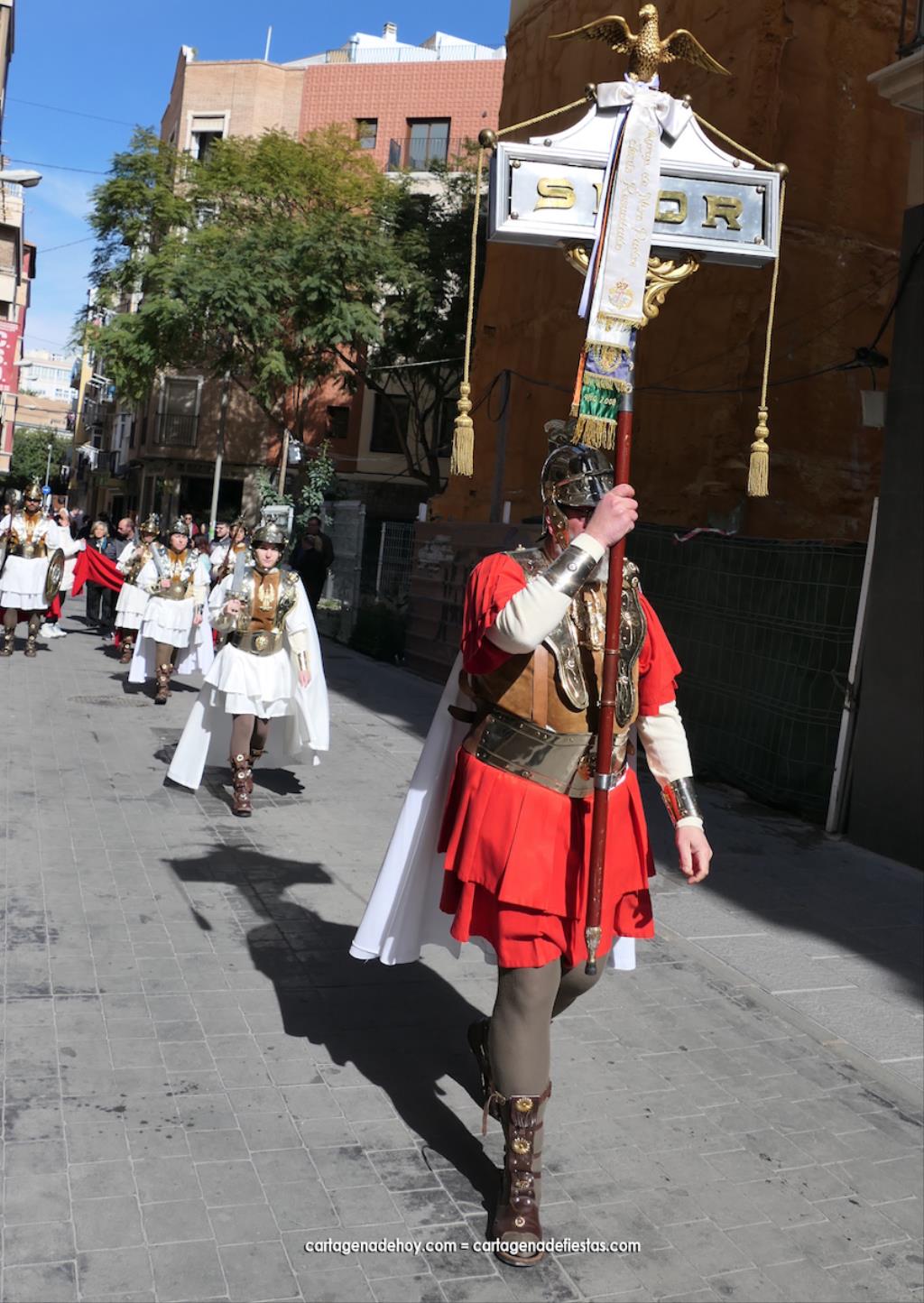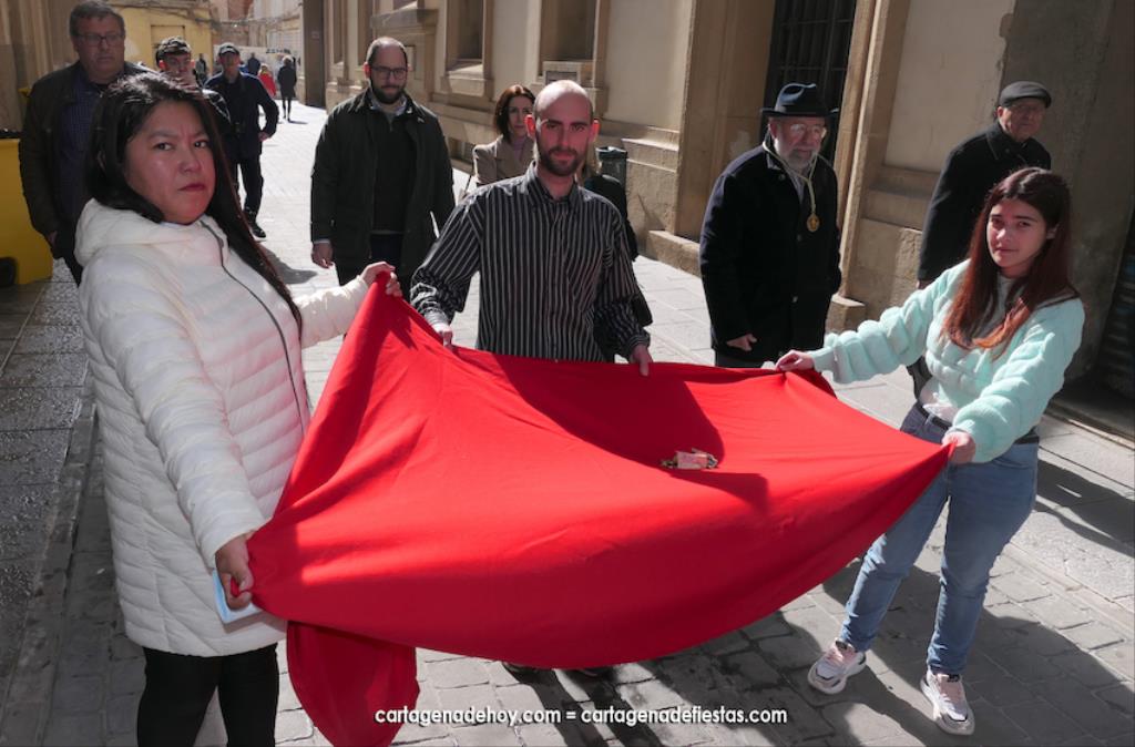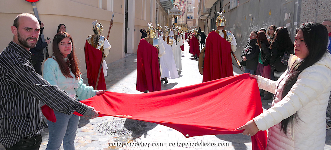 Entre las novedades de este pasacalles figura María Mínguez, quien desde el pasado mes de noviembre es la presidenta de la gestora de los romanos blancos, y que tres hermanos llevasen, a fina de la formación, una bandera roja sobre la que viandantes depositaban monedas y billetes. “Es la petitoria, que era muy habitual en los pasacalles de cuaresma hace varias décadas con el objetivo de recoger fondos para ayudar a las agrupaciones en sus gastos. Hemos decidido recuperar esta tradición, pues en su día lo habitual es que la petitoria cerrase al grupo”, explicaba a Cartagena de Hoy la hermana mayor de la cofradía, Marién García Boj.