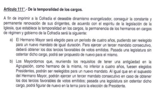 Las normas para el ordenamiento interno de la hermandad de Cristo de Prendimiento, elaboradoras en 2015, establecen que los mandatarios de las agrupaciones y el hermano mayor sólo pueden estar ocho años con dicho cargo, con una prolongación máxima hasta doce (incluyendo un tercer mandato) siempre que en las votaciones reciba dos terceras partes de los votos en el proceso electoral. Este requisito también abarca al hermano mayor.