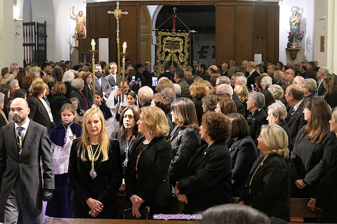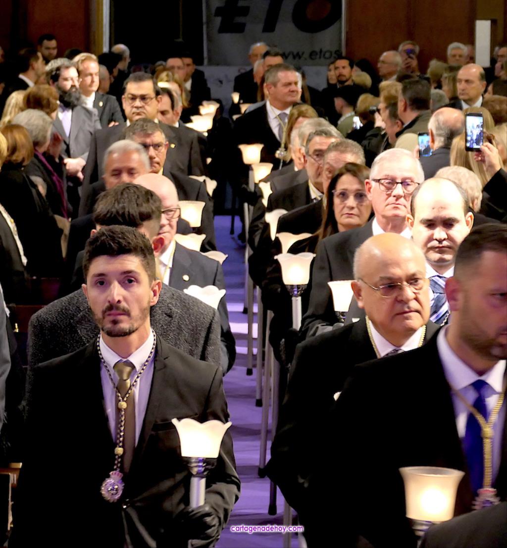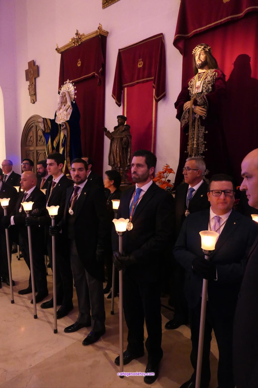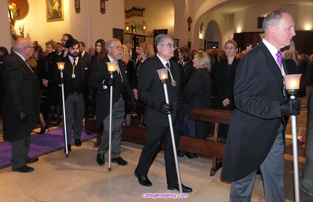 A las nueve de la noche ha comenzado este acto penitencial de cuaresma cuyas referencias más antiguas que se conservan se remontan al siglo XIX, aunque es posible que su origen sea anterior. Tras la bienvenida de la junta de mesa marraja a los invitados al acto, ha comenzado desde la capilla marraja una procesión claustral que ha pisado escasos metros de la calle Mayor, para después cruzar la entrada principal de la iglesia en una comitiva encabezada por el estandarte y una larga fila de alumbrantes, cerrando los principales distinguidos de la Semana Santa de Cartagena 2023, los hermanos mayores y el equipo eclesiástico.
